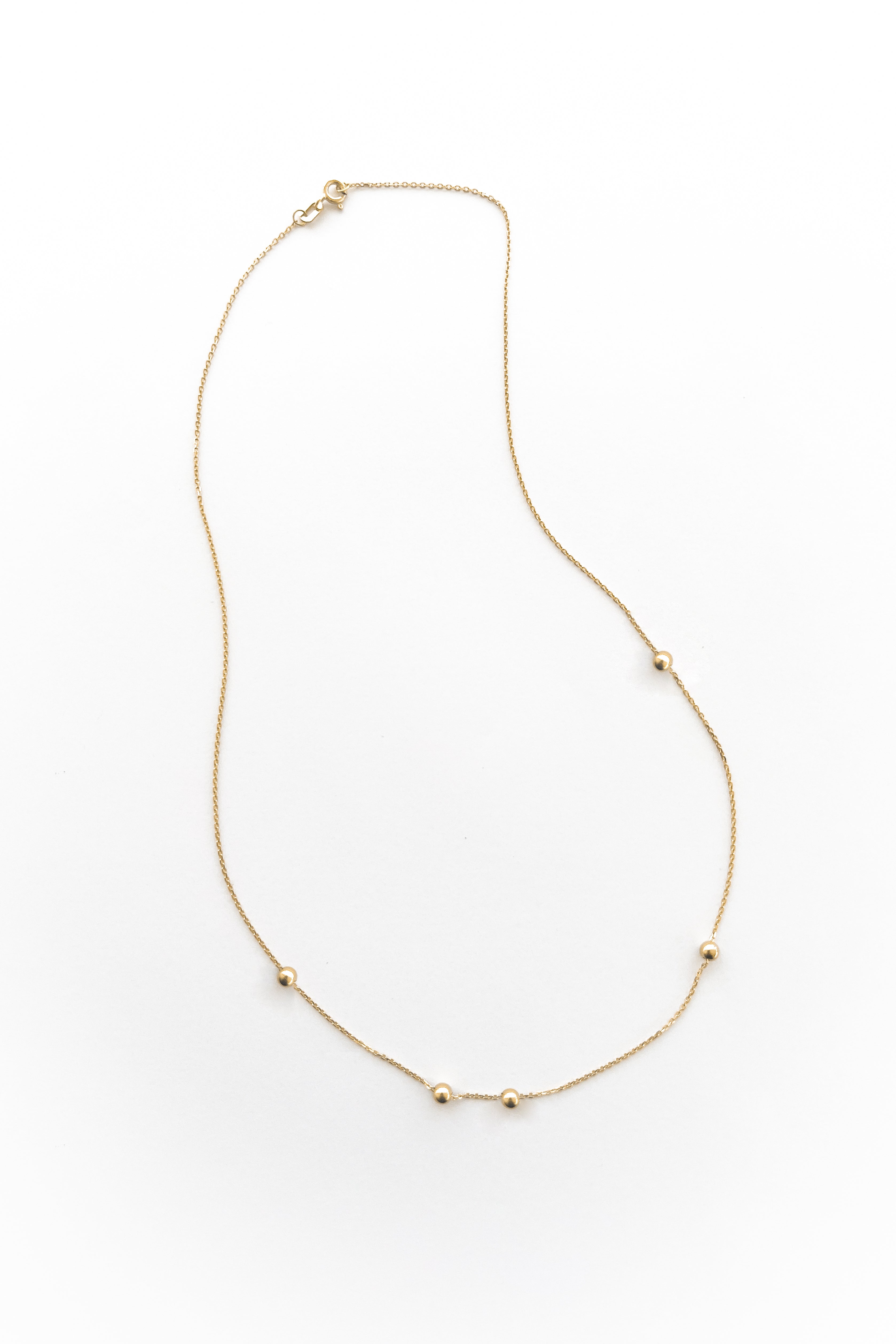 Handcrafted 18K yellow gold necklace with a 50 cm long chain and five 4 mm diameter mini spheres in 18K gold.