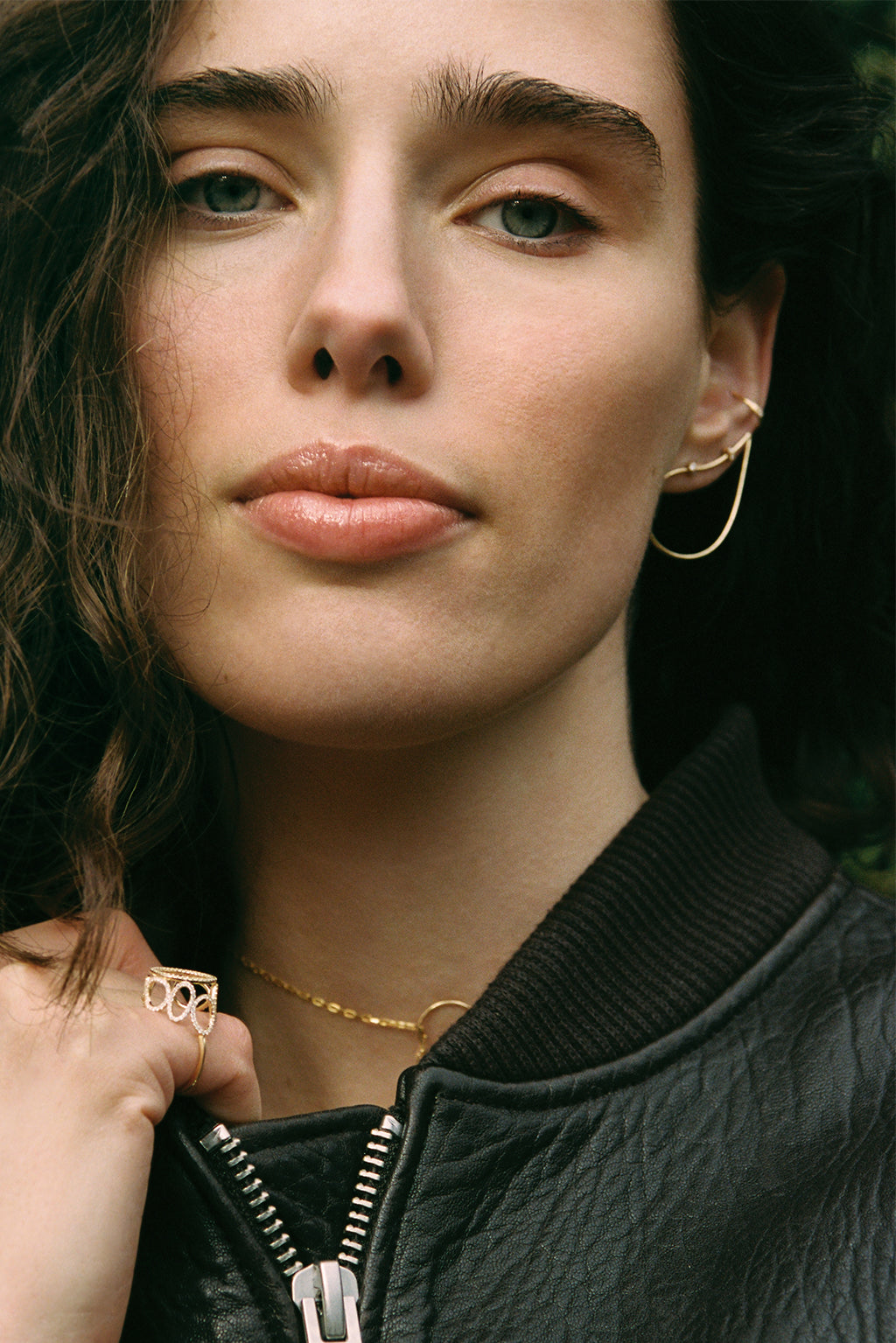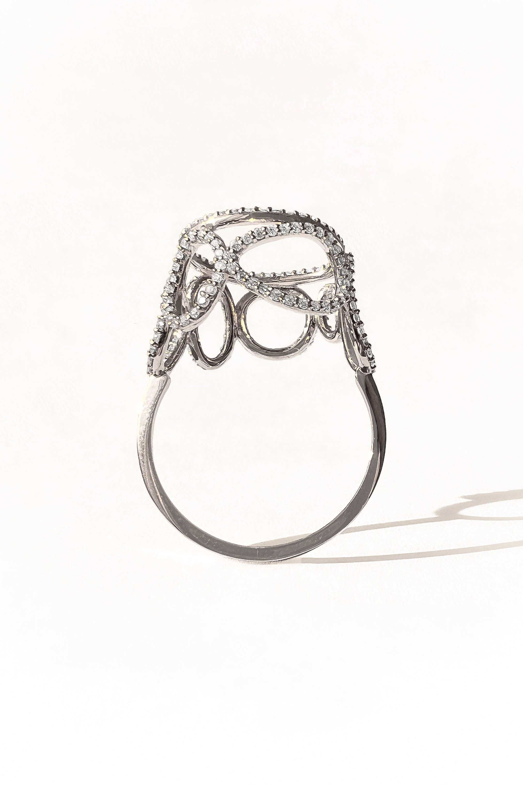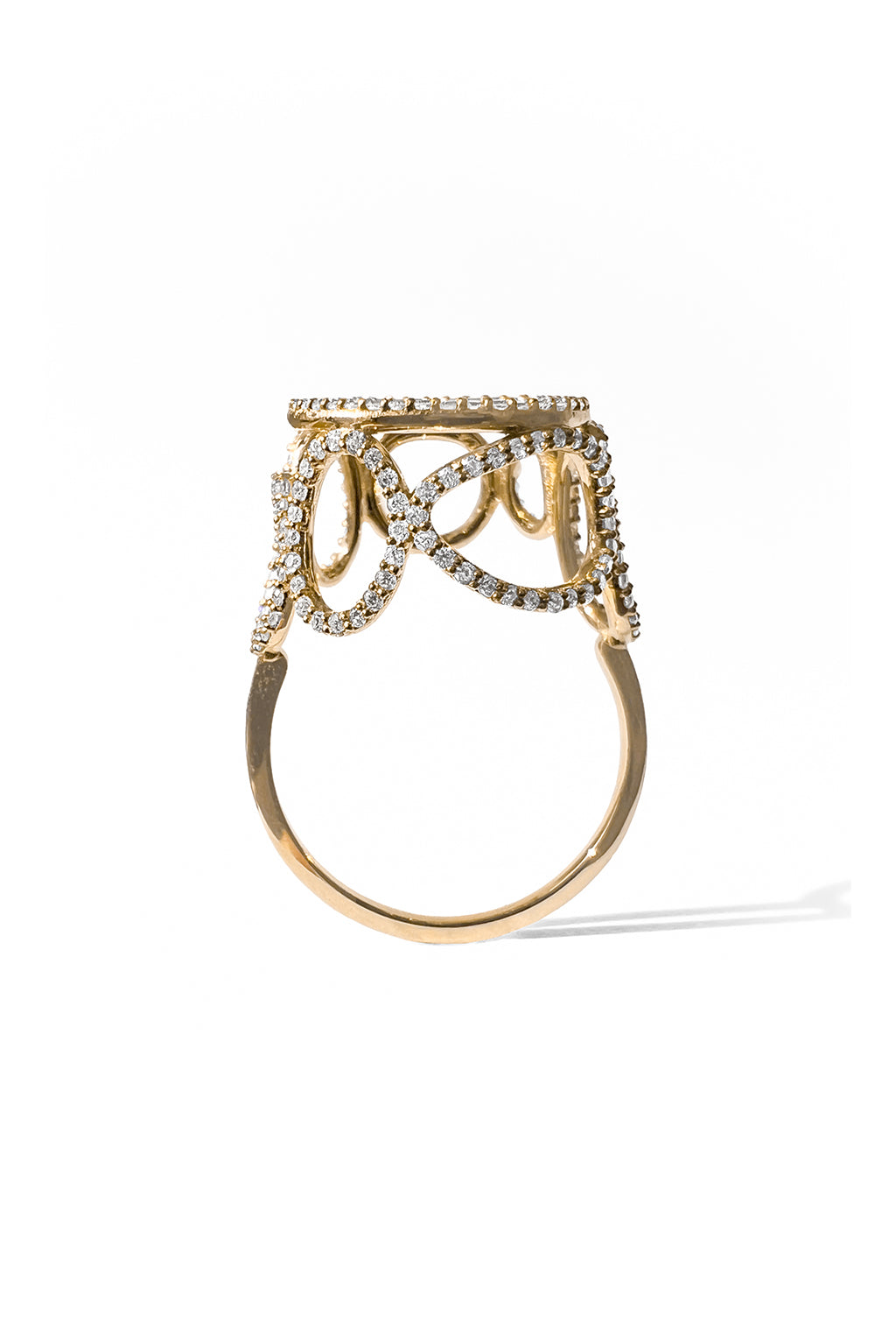 18k gold ring made up of irregular ovals set with diamonds elevated 8 mm from the finger.