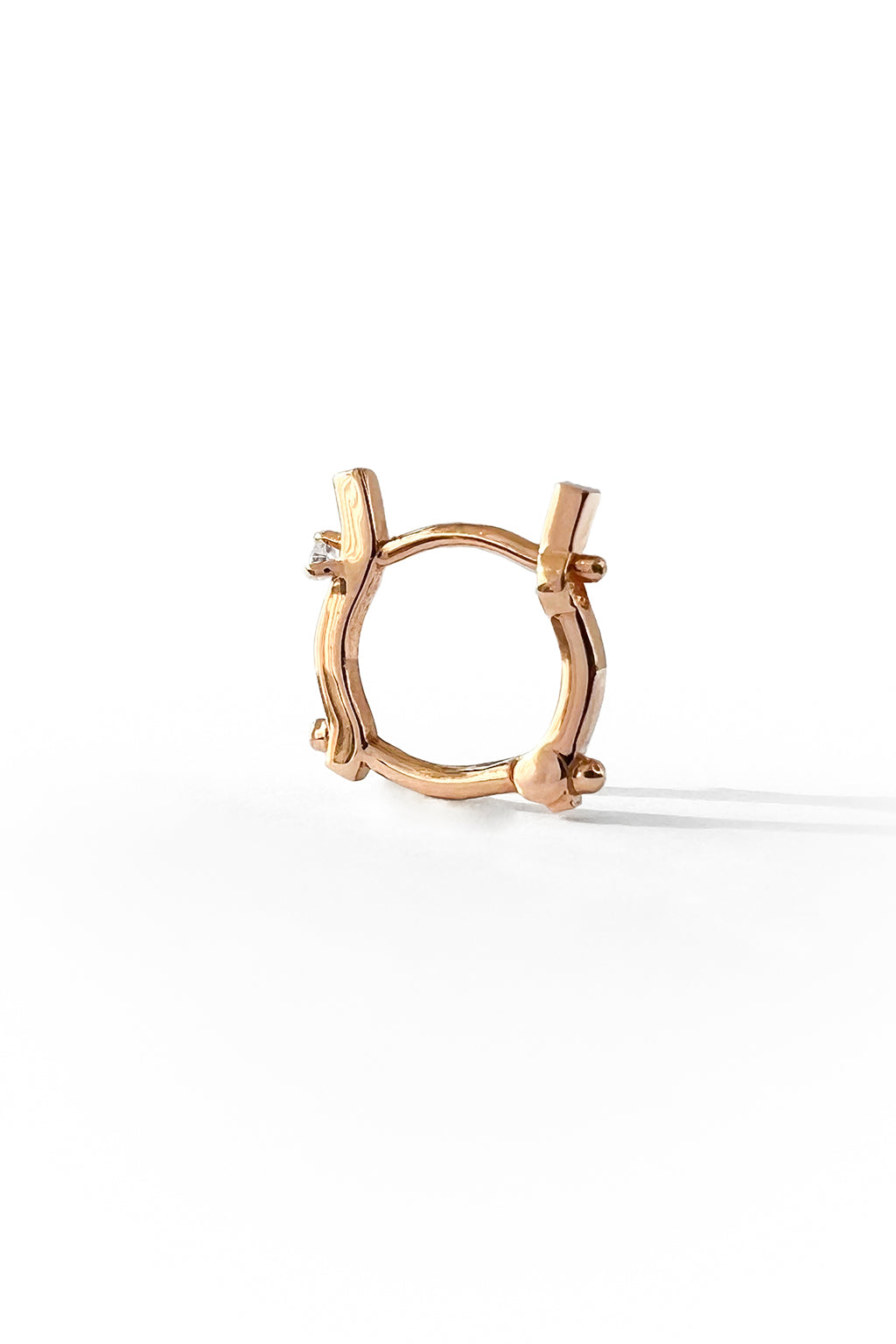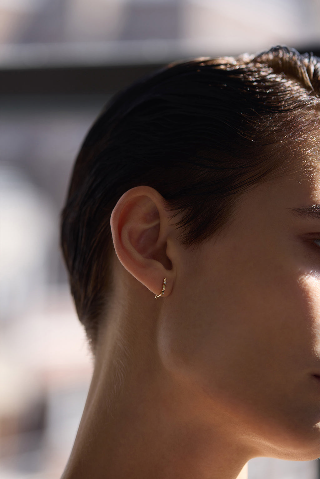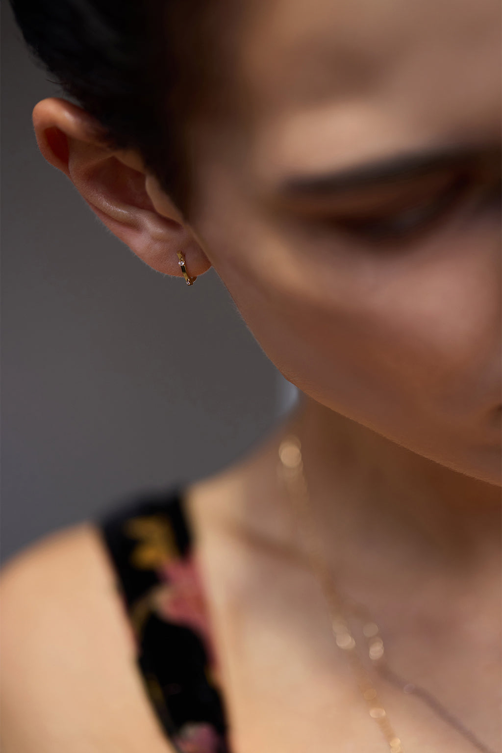 This delicate and thin 18k gold earring combines squared and rounded sections with subtle Eastern-inspired design. Hidden diamonds create the illusion of four articulated parts, while the earring remains a 7 mm inside diameter and 1,1mm thickness minibangle. Its refined craftsmanship and oriental influences evoke a sense of timeless elegance and cultural artistry.