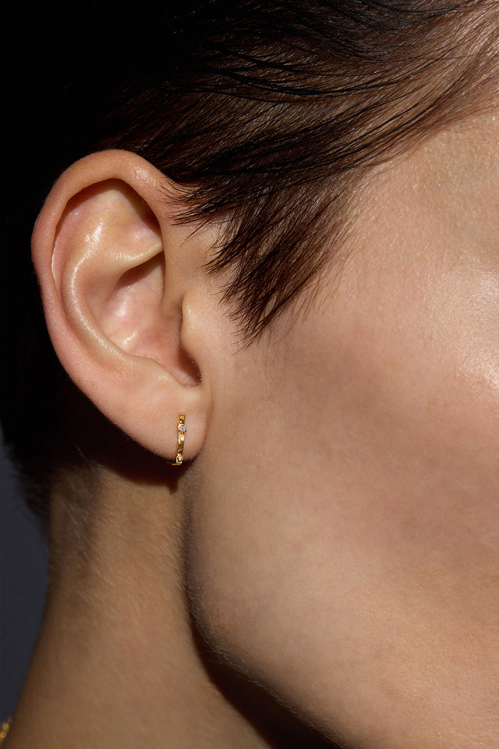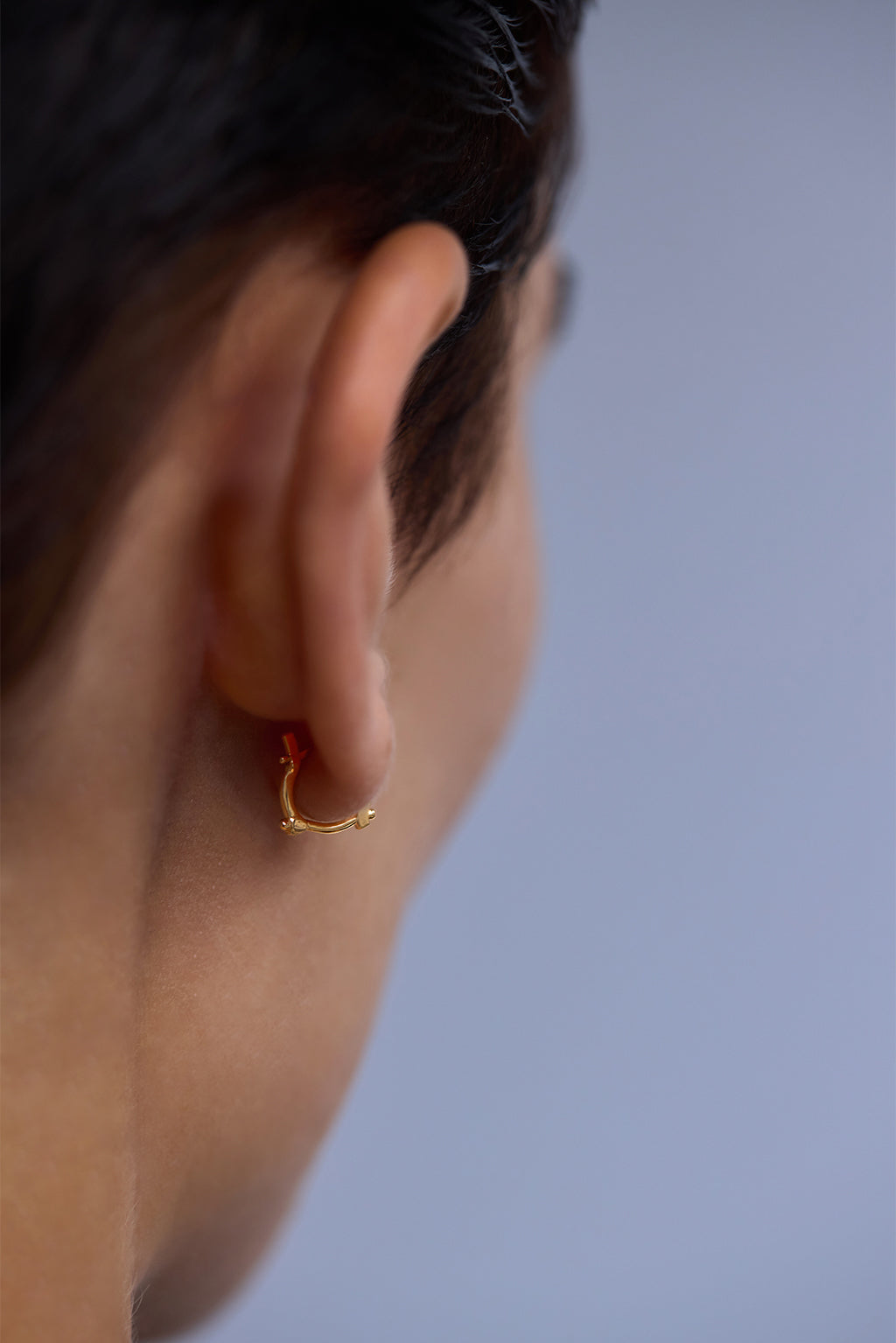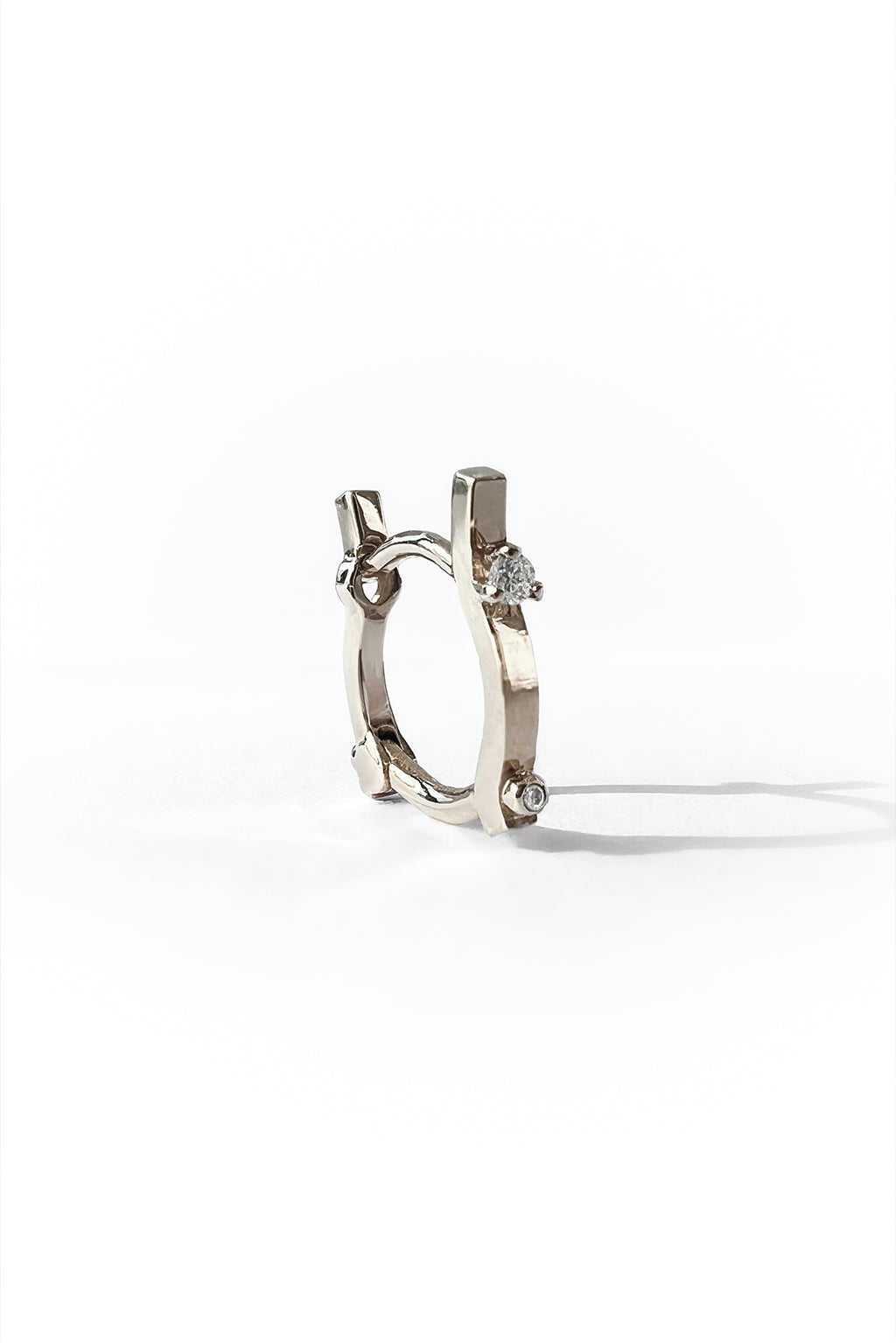 This delicate and thin 18k gold earring combines squared and rounded sections with subtle Eastern-inspired design. Hidden diamonds create the illusion of four articulated parts, while the earring remains a 7 mm inside diameter and 1,1mm thickness minibangle. Its refined craftsmanship and oriental influences evoke a sense of timeless elegance and cultural artistry.