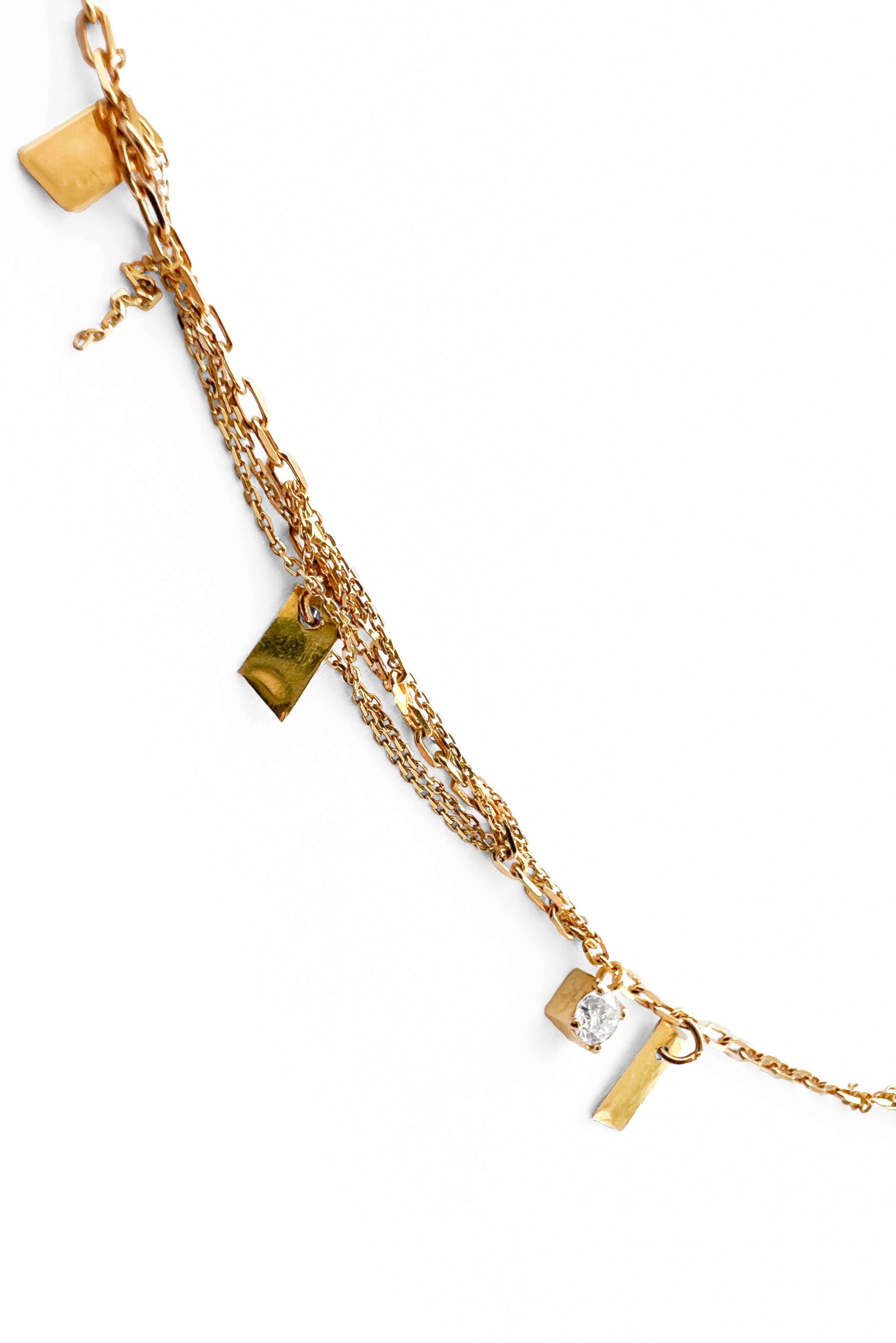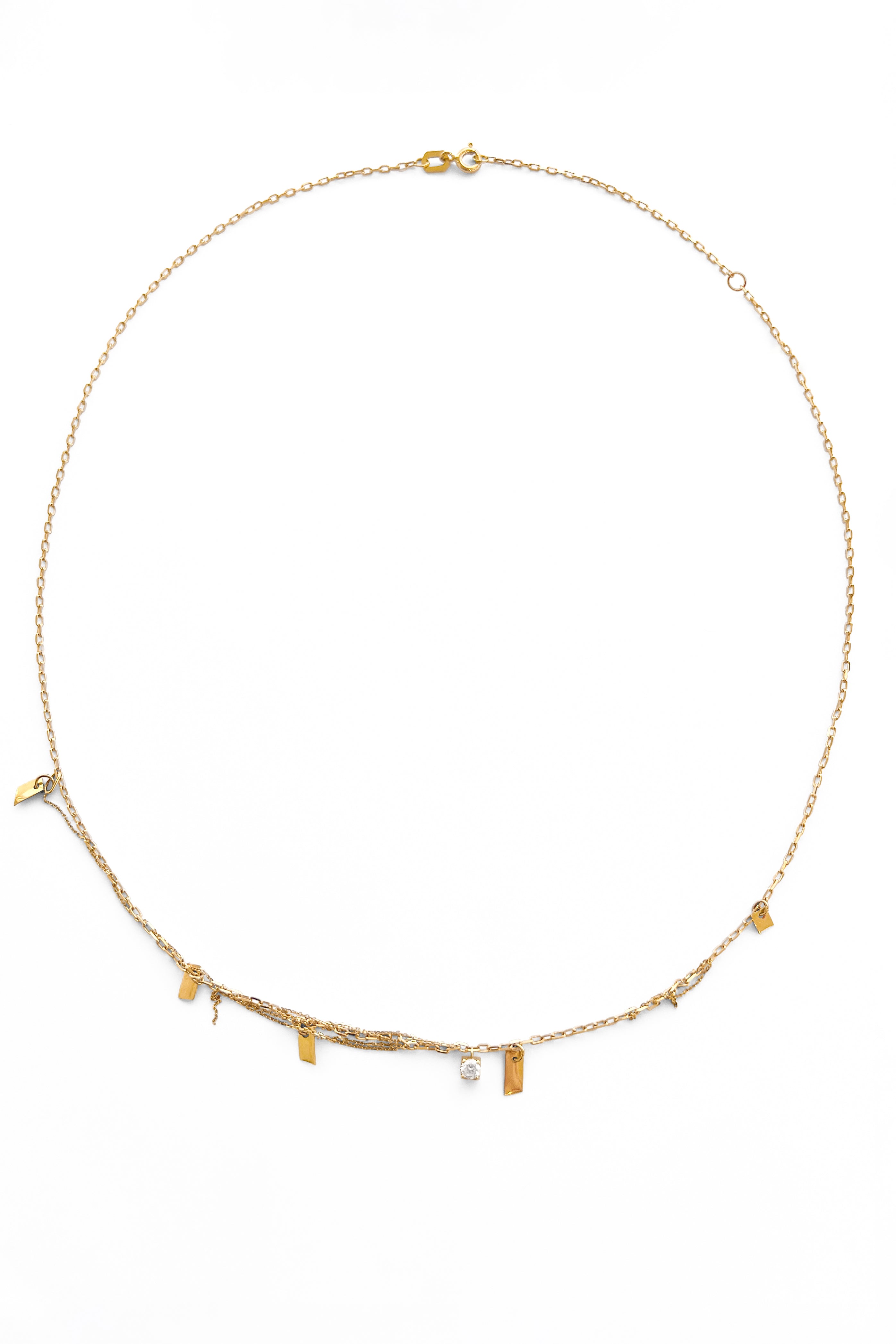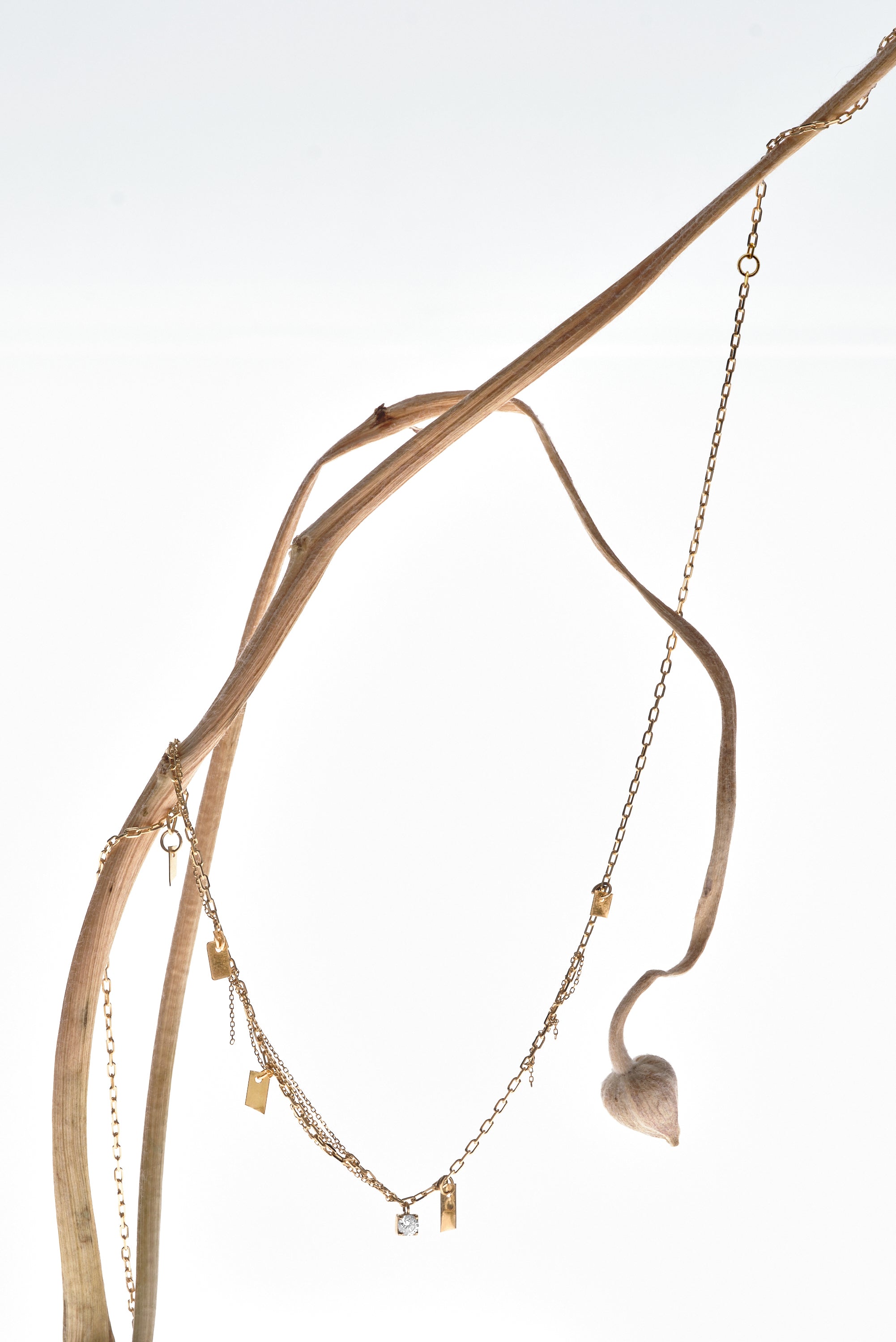 A 50 cm chain in 18k yellow gold on which fragments of very fine chains are intertwined, the overall composition of which is balanced by 5 very light and irregular gold plates and a 3 mm diamond set in a yellow gold caset. This model is a second version of the Lost Treasures necklace. Both evoke the value and meaning that objects acquire over time, the relics of the past.