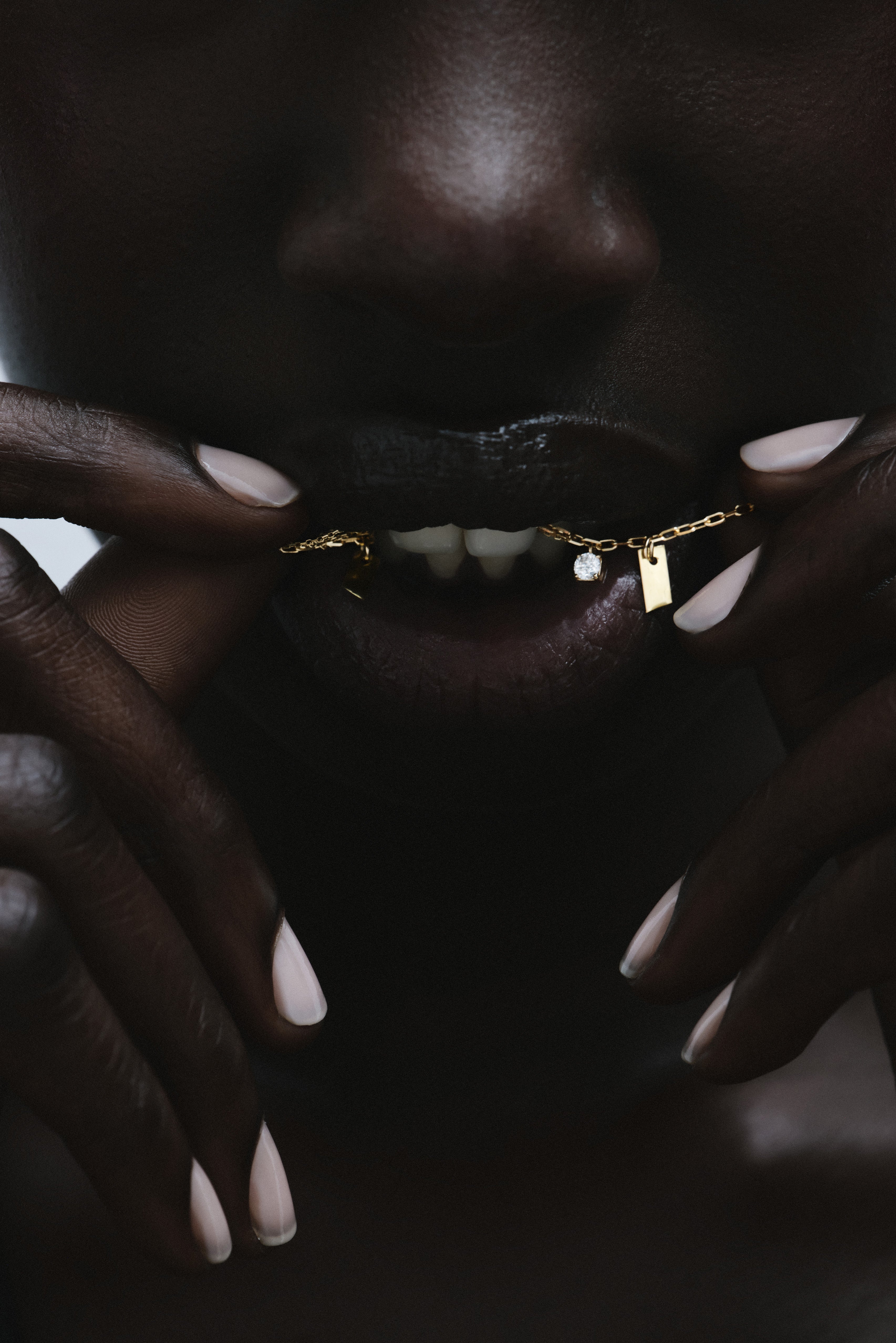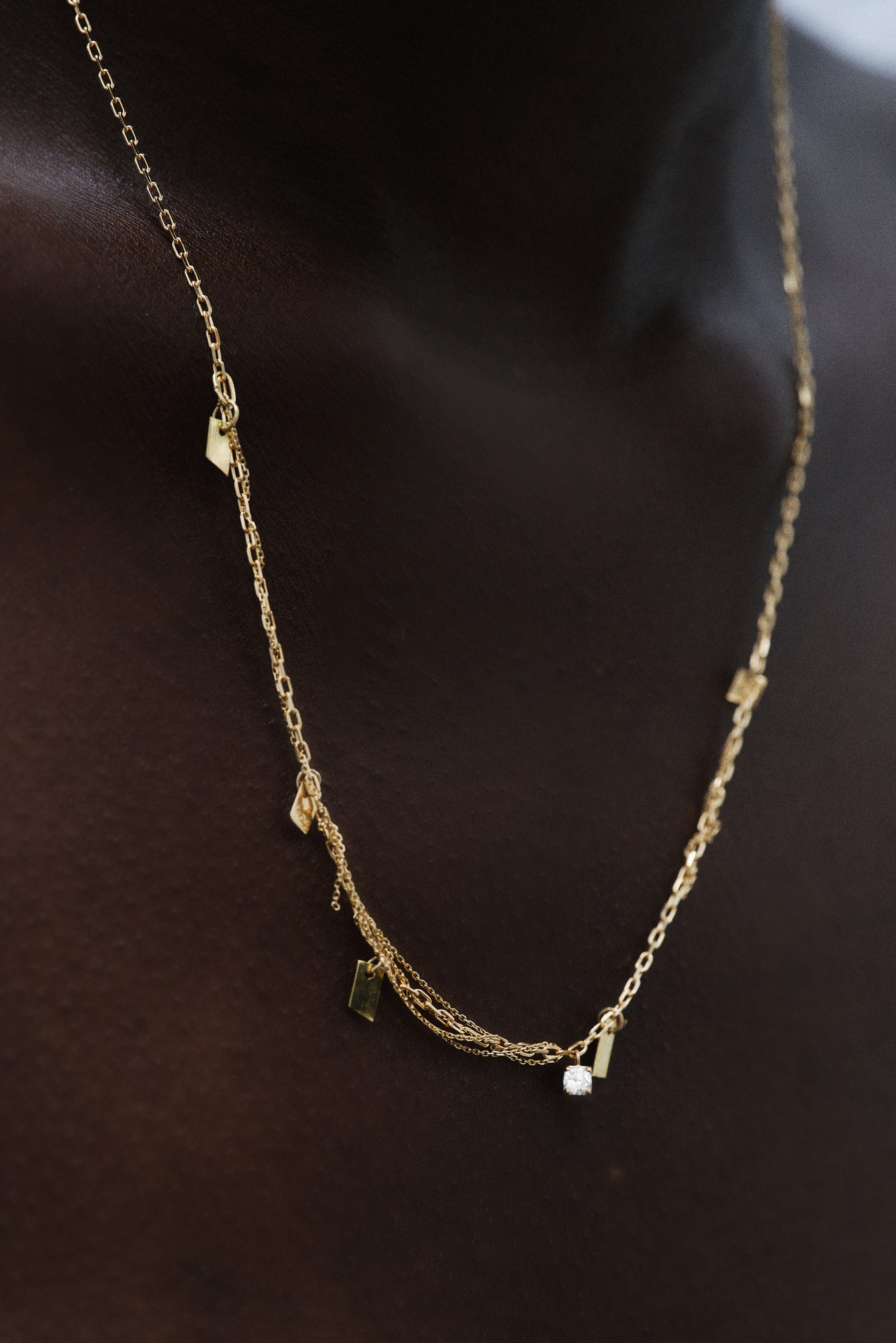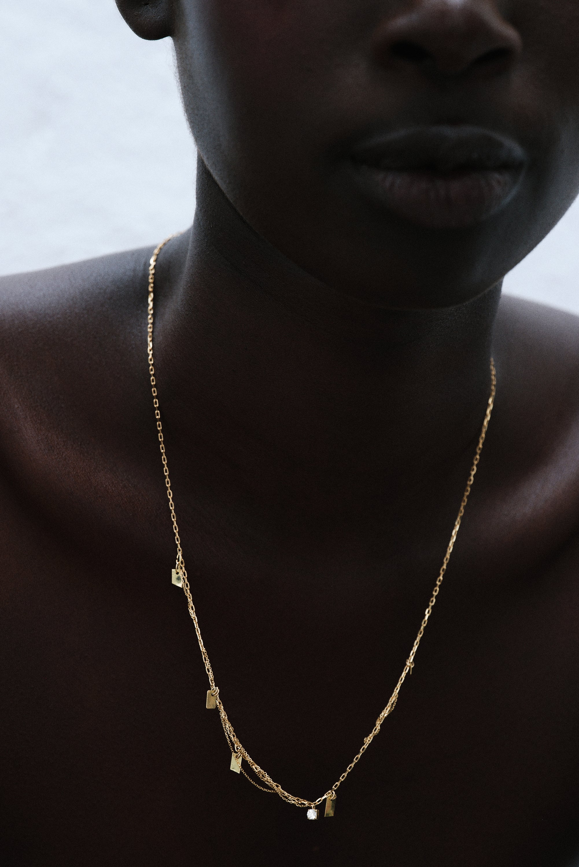 A 50 cm chain in 18k yellow gold on which fragments of very fine chains are intertwined, the overall composition of which is balanced by 5 very light and irregular gold plates and a 3 mm diamond set in a yellow gold caset. This model is a second version of the Lost Treasures necklace. Both evoke the value and meaning that objects acquire over time, the relics of the past.