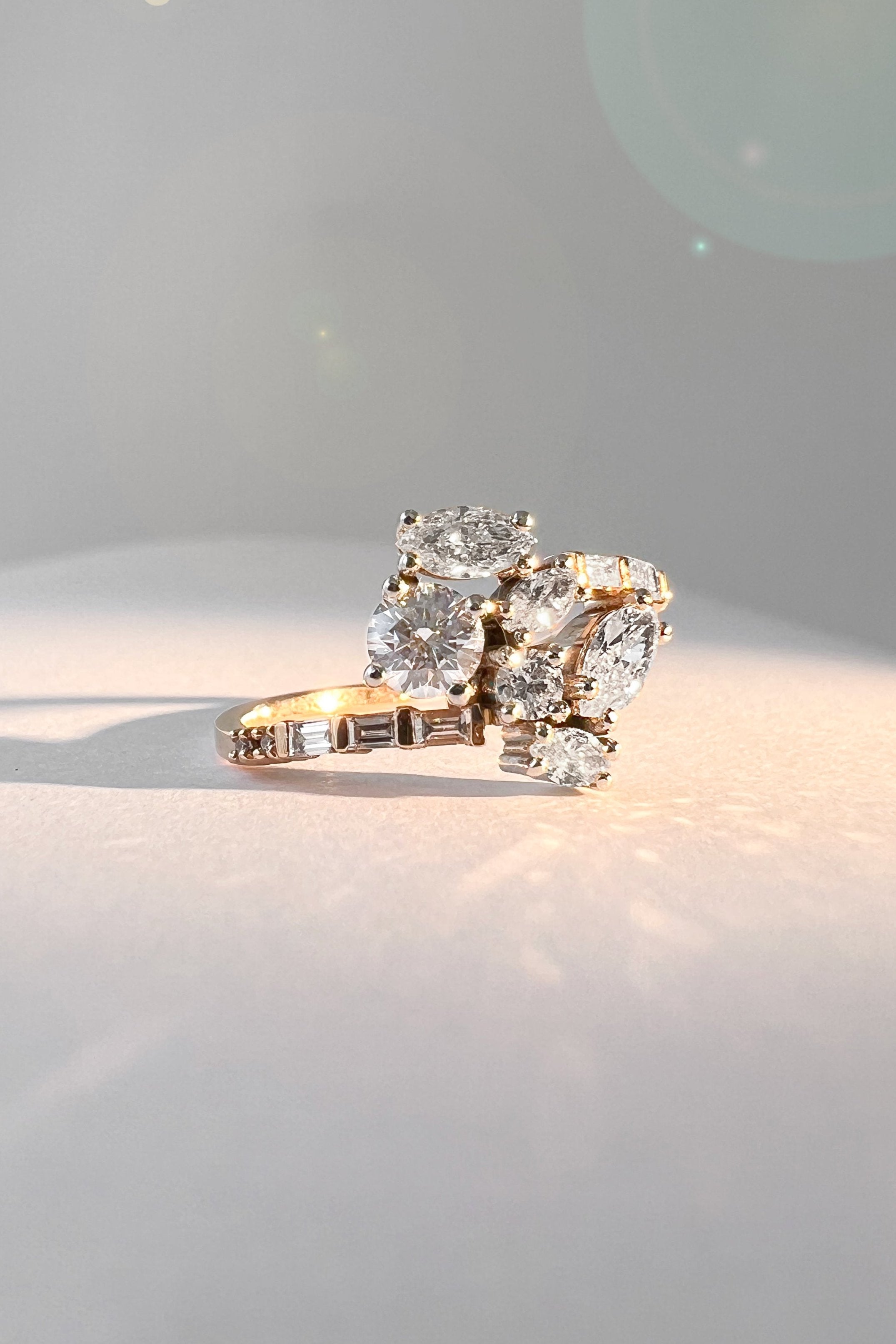 DIAMOND CUT - Round (4 diamonds 0,9 mm, 1 diamond 2,5 mm and 1 diamond 4 mm), marquise (2 diamonds 2,5 mm x 5 mm, 1 diamond 3 mm x 6 mm and 1 diamond 3,5 mm x 2 mm) and baguette (6 diamonds 2,1 mm x 1,2 mm)