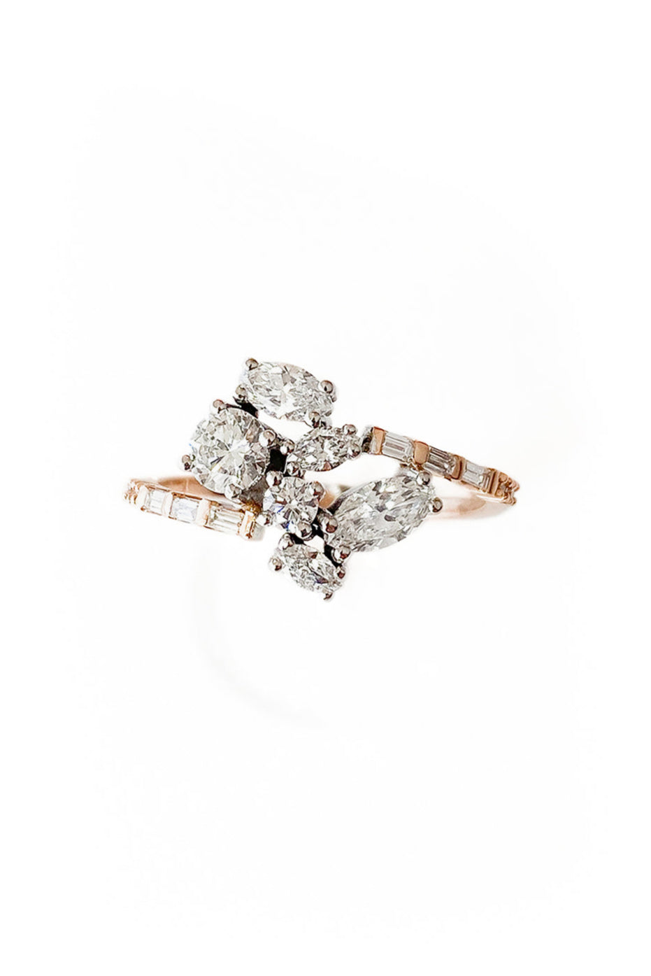 Handcrafted in 18K rose gold with a squared shank and a 18K white gold diamond setting.