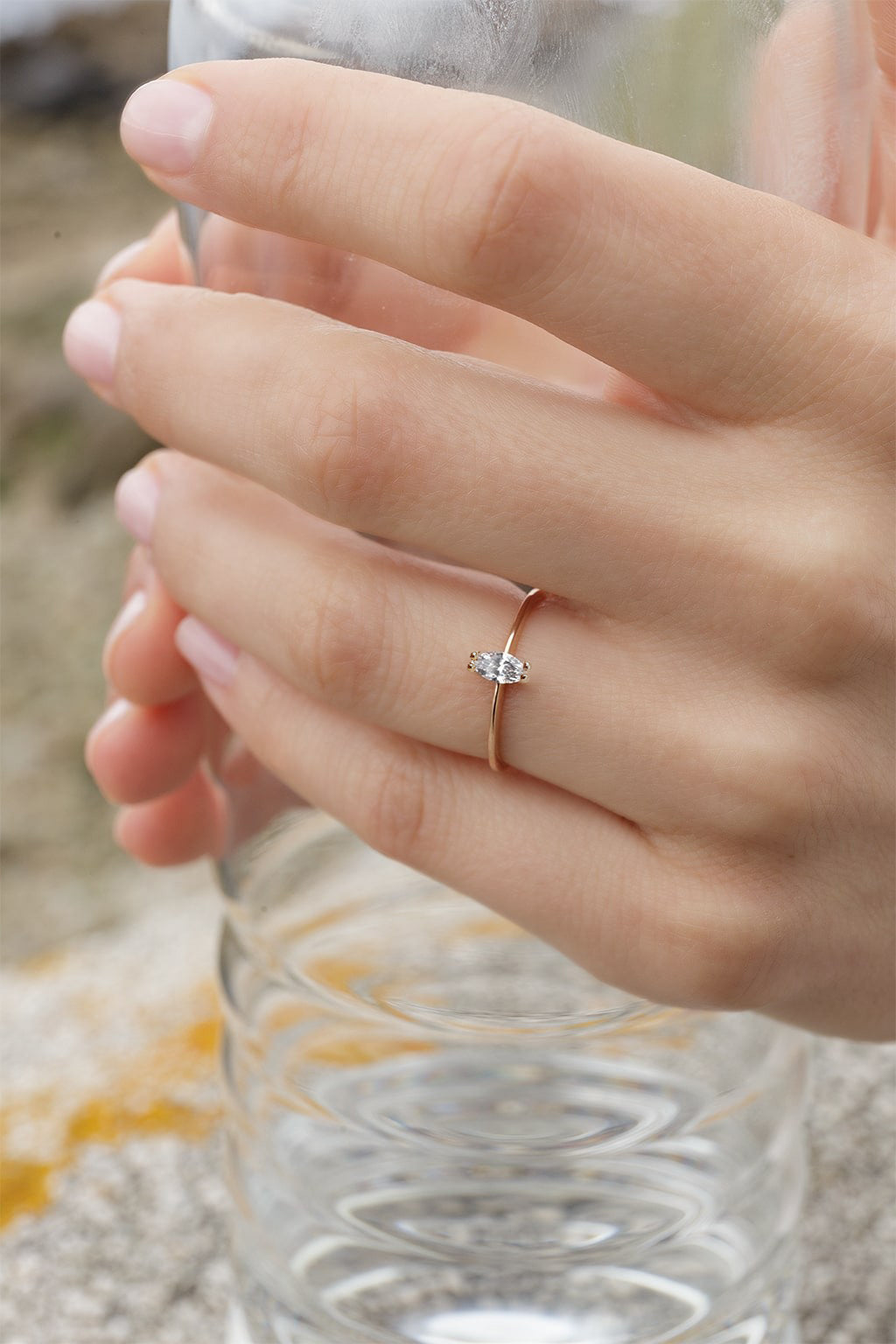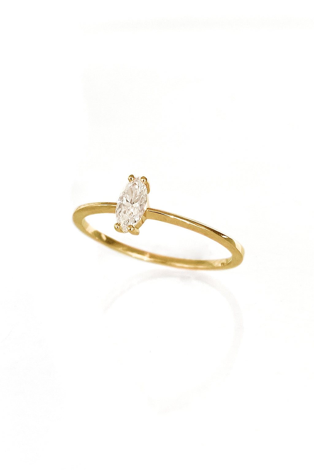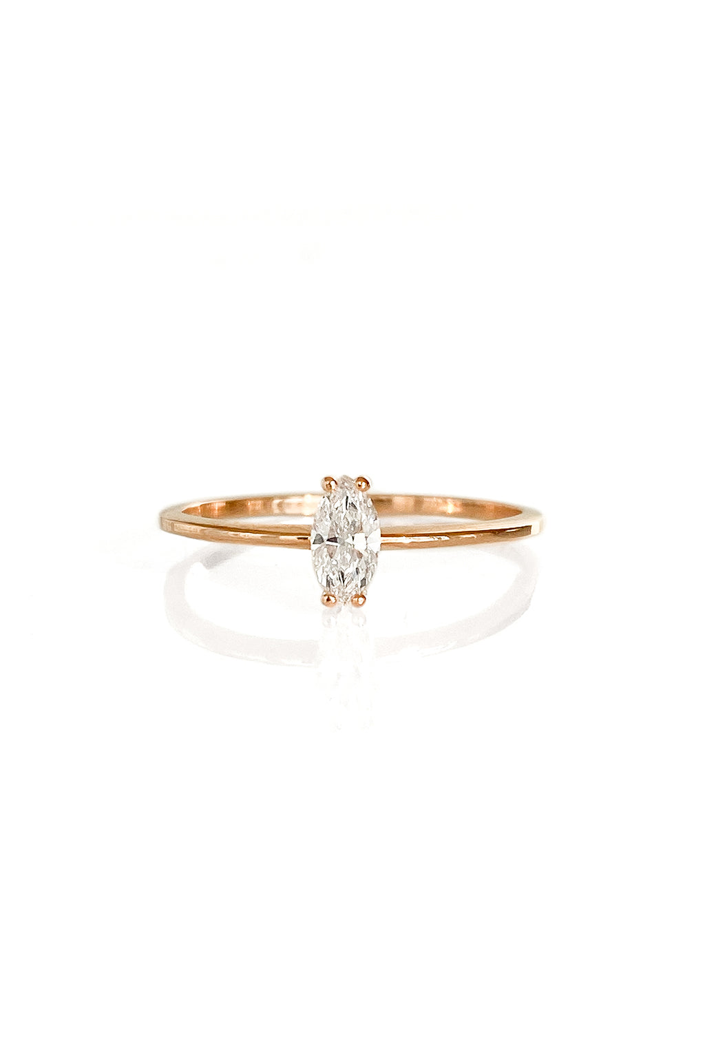 Handcrafted in 18K gold with a knife edge shank and a marquise cut diamond.