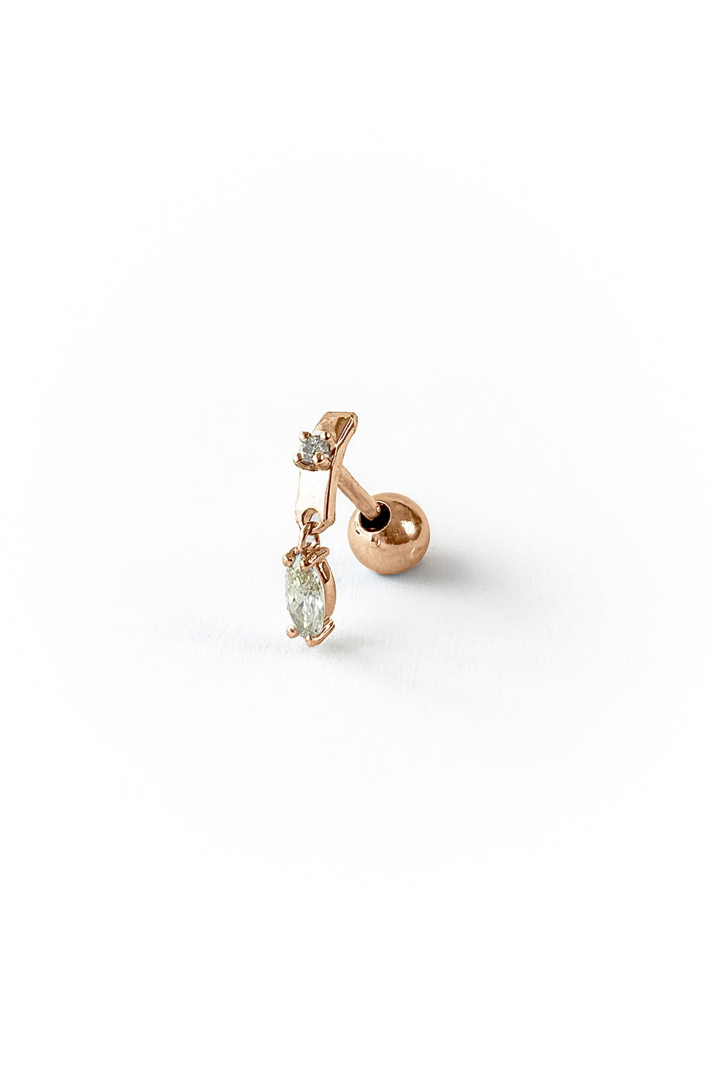 This delicate and elegant 18k gold earring features a small 5 x 1,5 mm plaque with a round diamond, from which a yellow marquise-cut diamond is articulated, with slight variations in size. The design includes a traditional straight spike and a spherical gold pressure setting. The piece is small, refined and elegant.