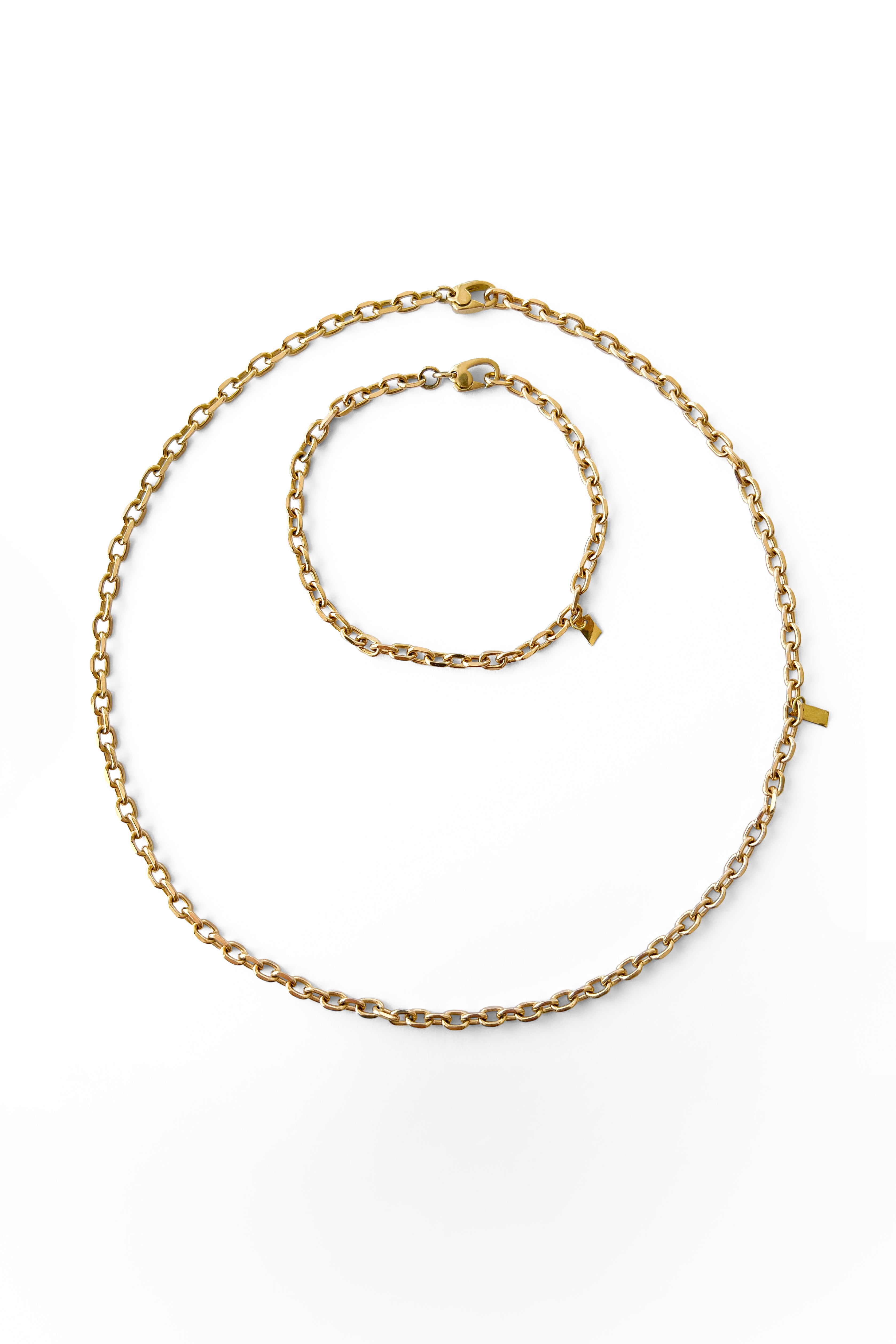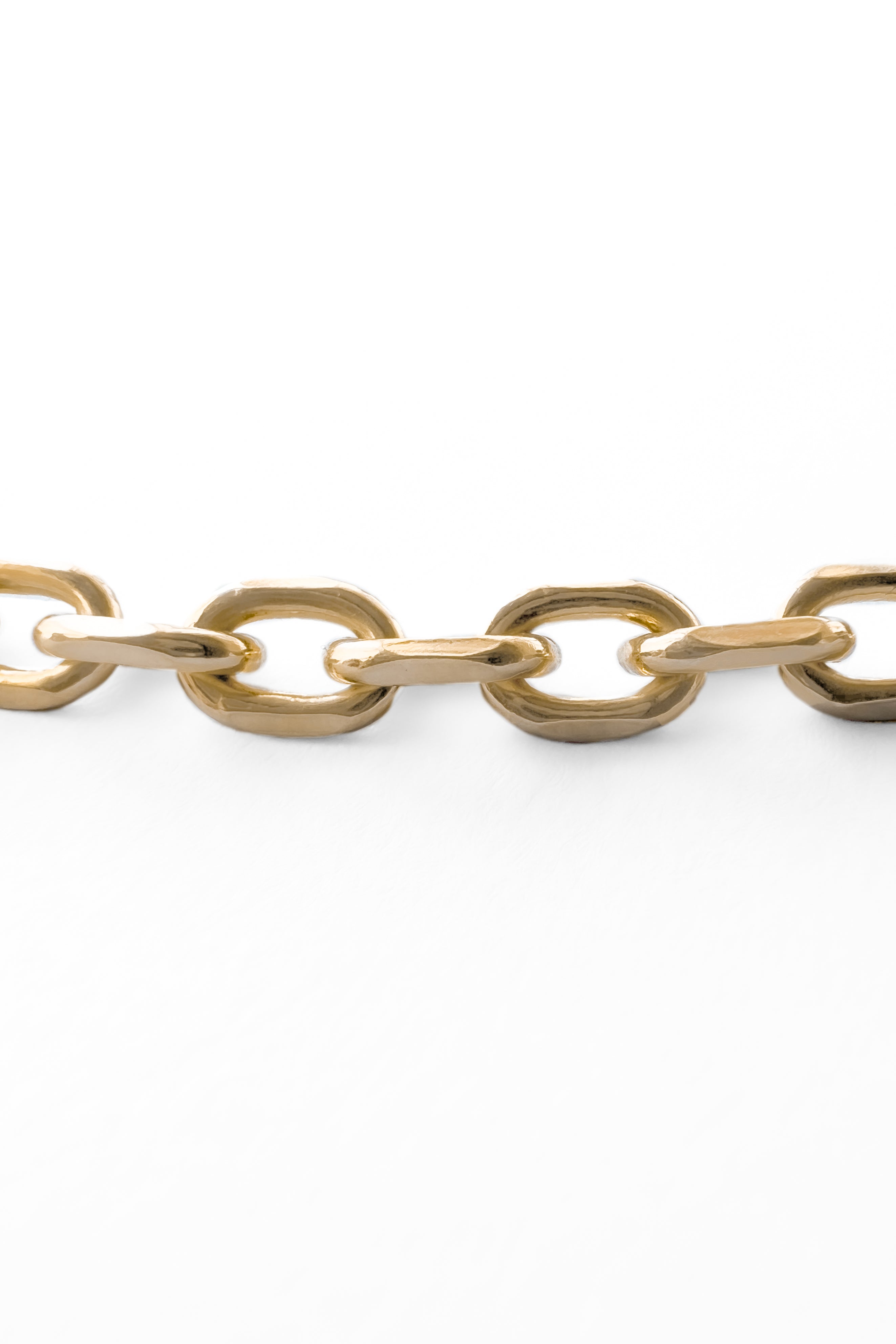 17 cm length 18k gold bracelet. Its thick links contrast with a light gold plate and allow the carabiner to be hooked on any length of the chain.