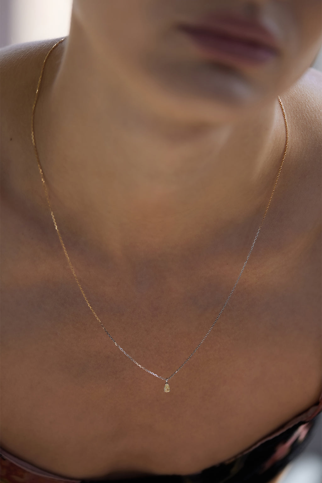50 cm yellow gold chain, crafted in 18k gold, with a section accented by rhodium plating, adding a modern contrast to its classic design. The centerpiece is a pear-shaped diamond set in a sleek white gold setting.