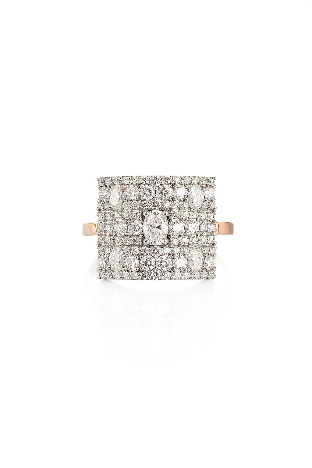 Diamonds set in a white gold 12 x 15 mm central setting and squared section 18K rose gold band with a 1.6 x 1.2 mm thickness.