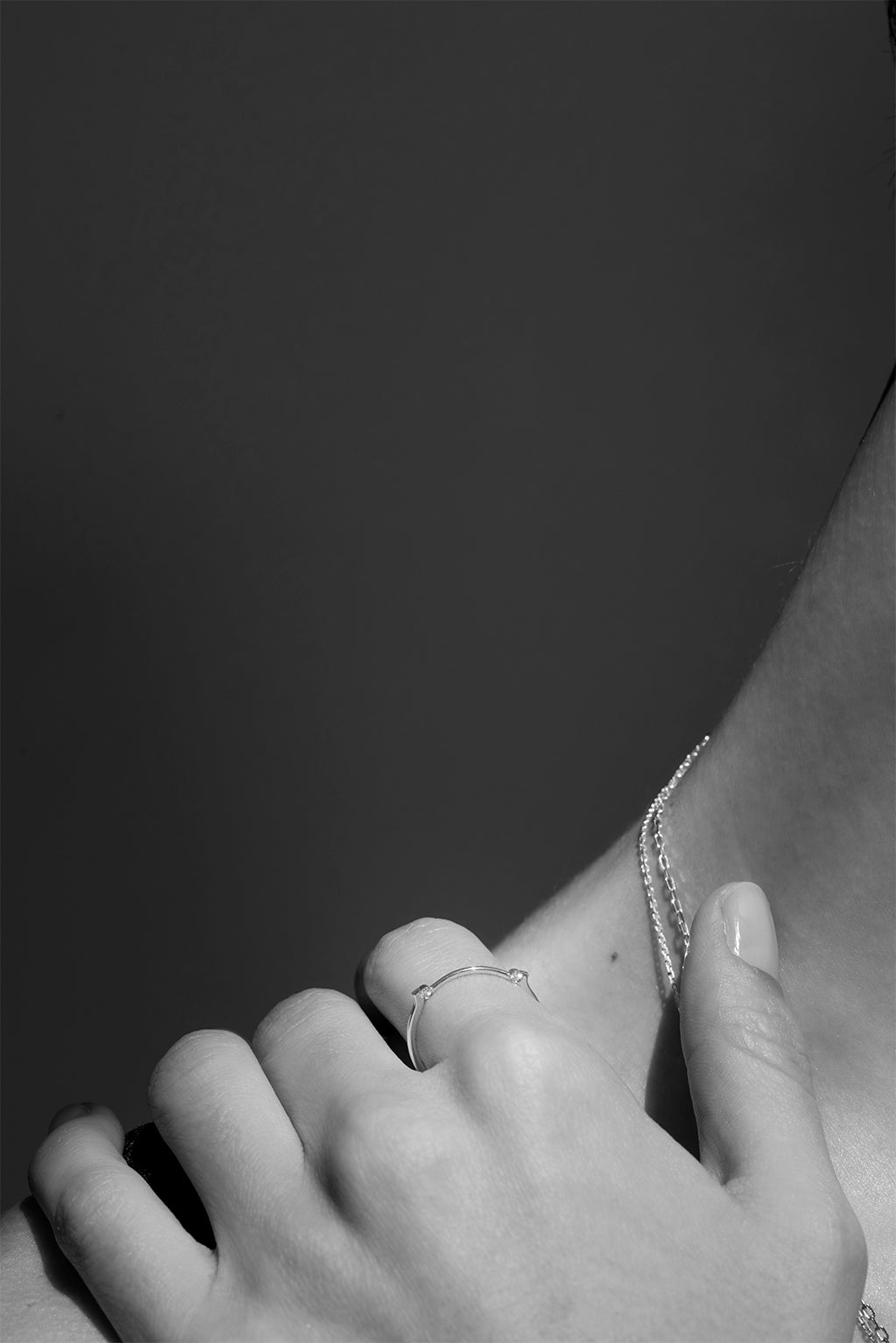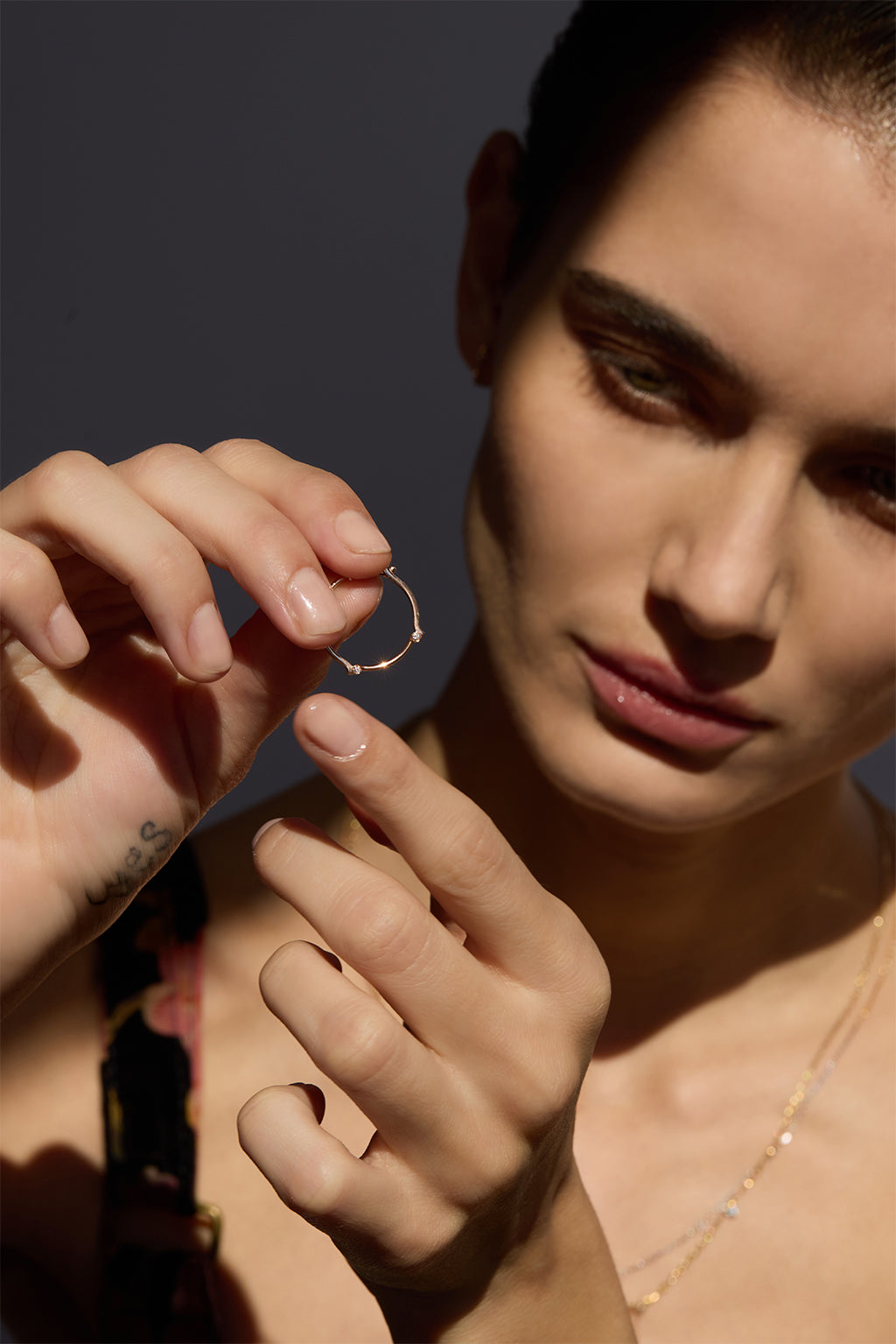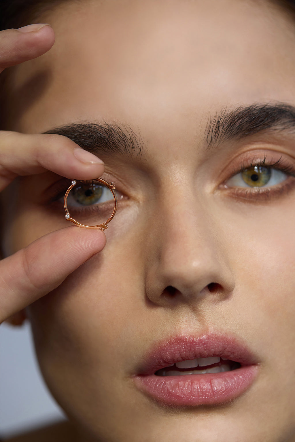 This delicate 18k ring blends squared and rounded sections with Eastern-inspired silhouette. Hidden lateral diamonds create the illusion of articulation, while it remains a single solid piece. Its refined craftsmanship and oriental influences evoke a sense of timeless elegance and cultural artistry.