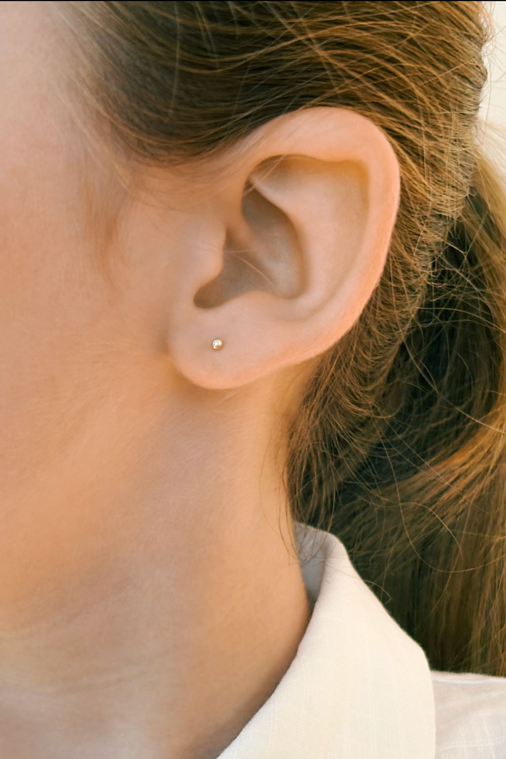 A pair of delicate baby earrings, each featuring a diamond set in a circular gold bezel (2 mm).