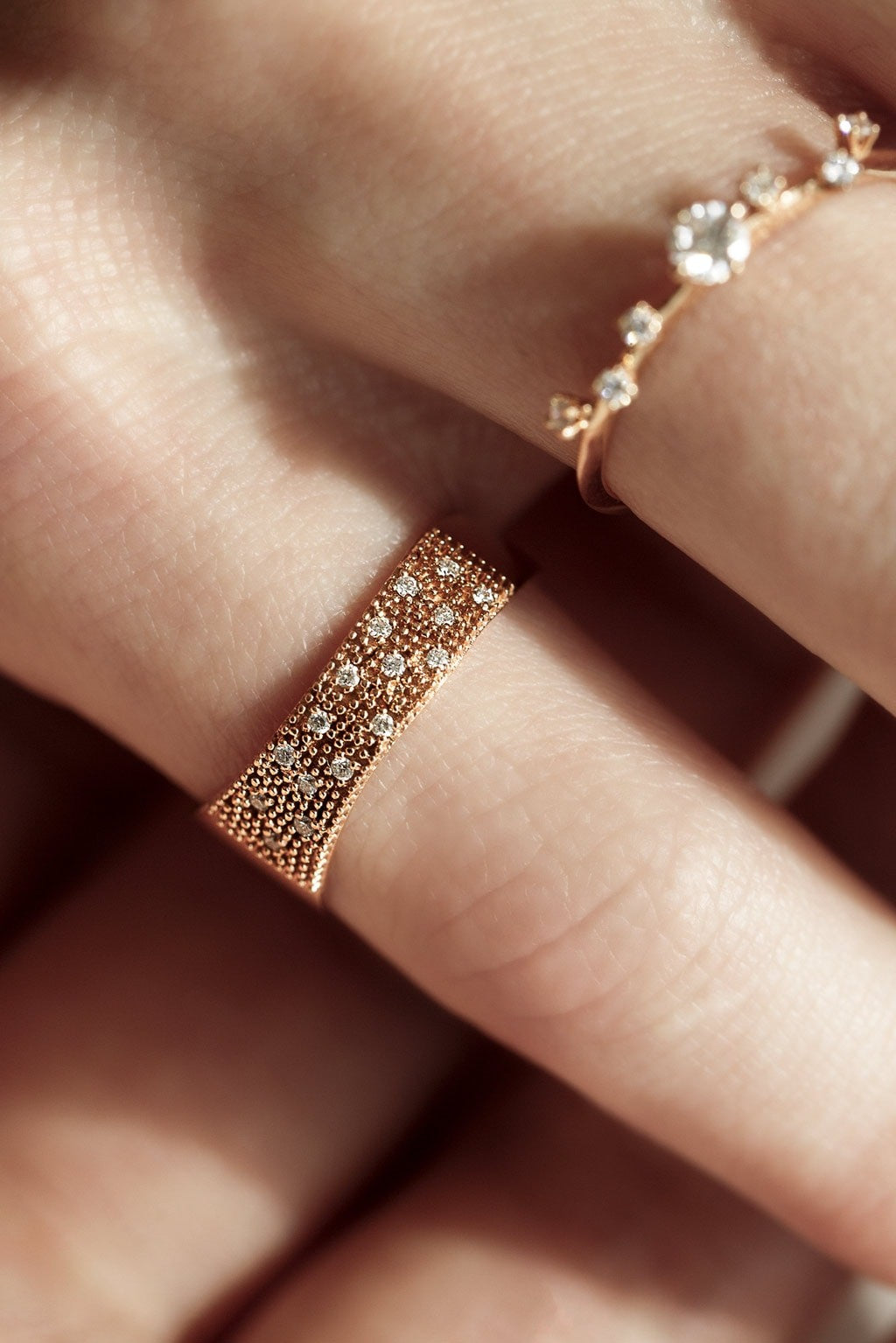 Handcrafted in 18K gold with an irregular shaped band. Width varies from 3 to 7 mm and thickness is 0,6 mm.DIAMONDS (cts) - 0.048