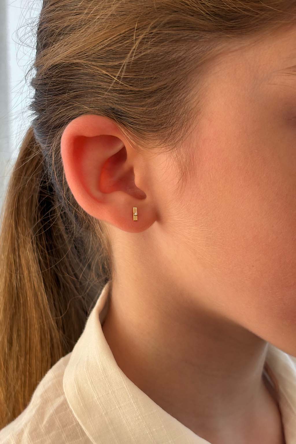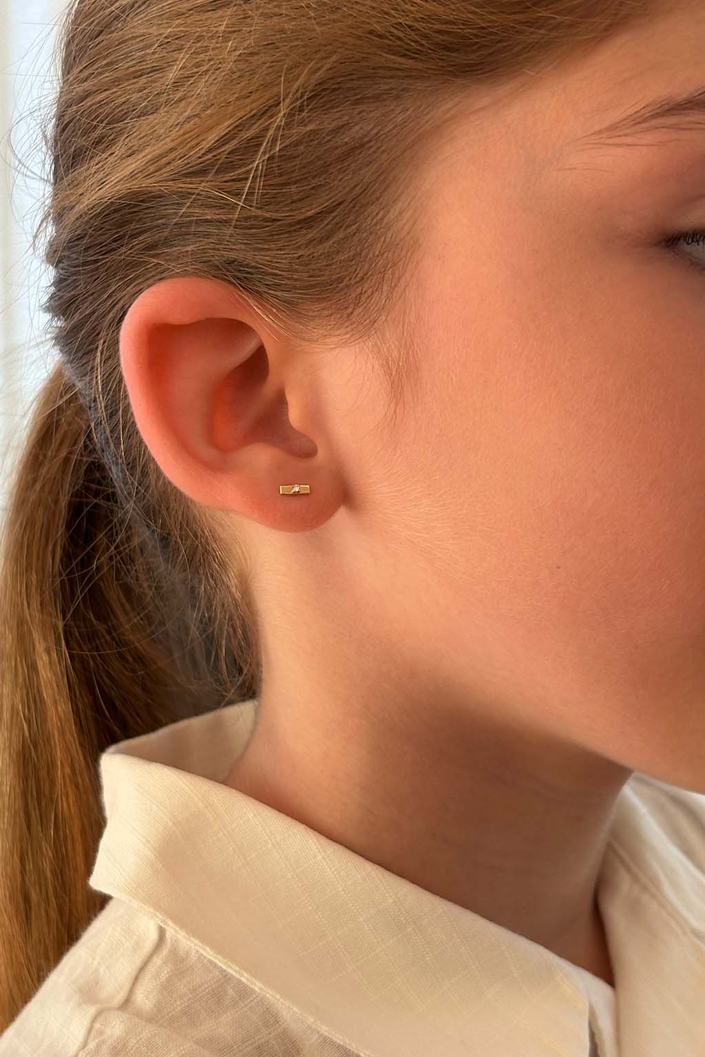 A pair of delicate baby earrings, each featuring a tiny rectangular gold plate (1.1 × 5.6 mm) with a single diamond set at its center.