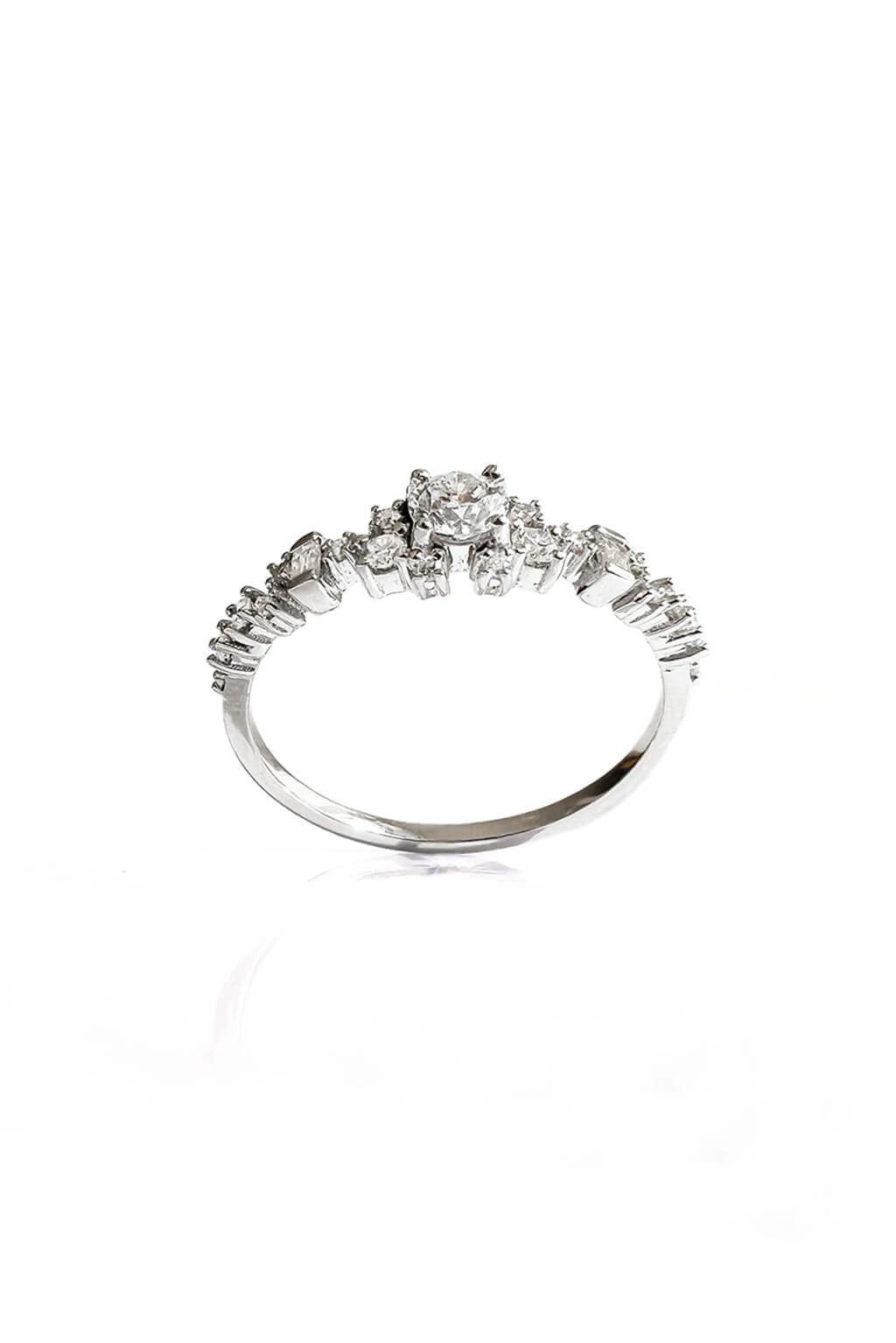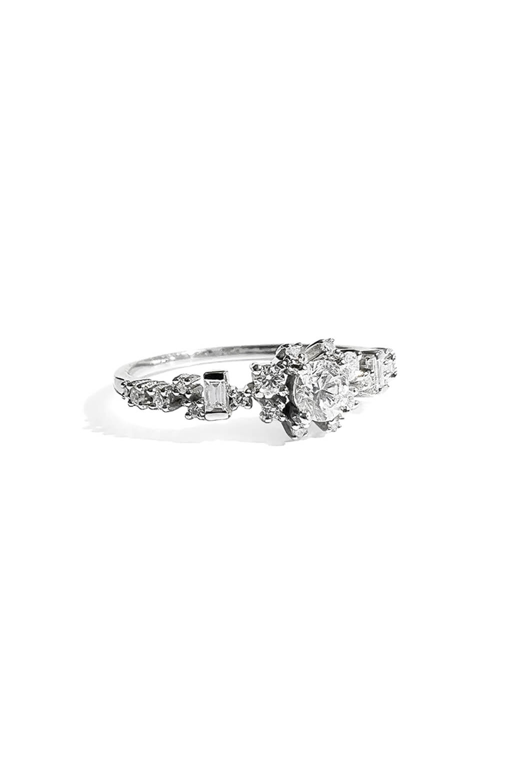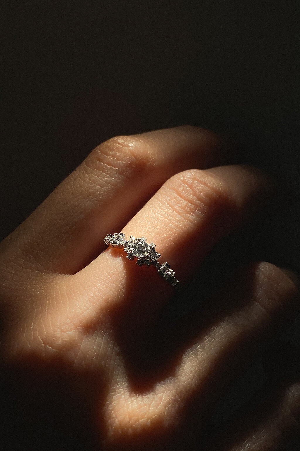 Symmetrical composition of diamonds of different sizes and cuts around a 3.5 mm central round shape diamond, maintaining the essence of the Rain ring collection.