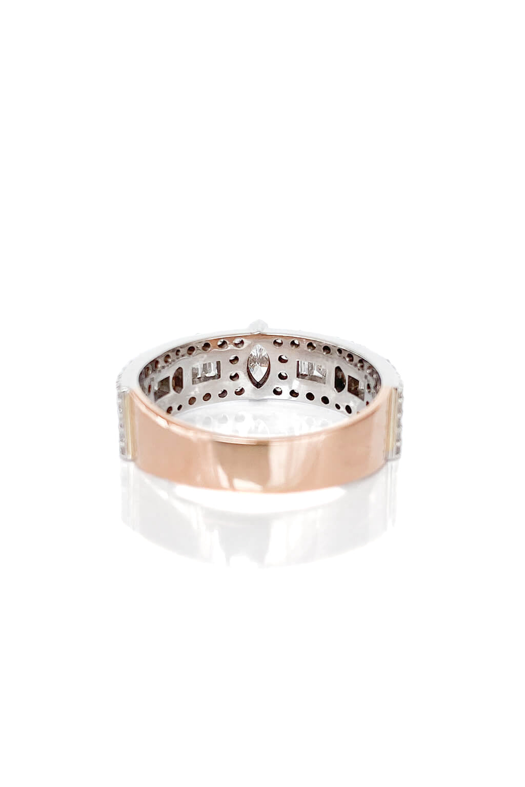 This ring features an 18K white gold 40 x 1,2 mm diamond setting and an 18K rose gold 0,9mm thick band. This ring has an irregular width, from 6 mm in the front (diamond setting) to 4 mm in the back.