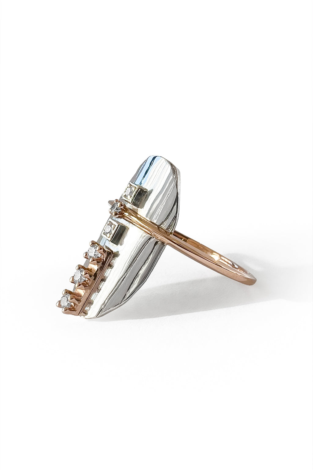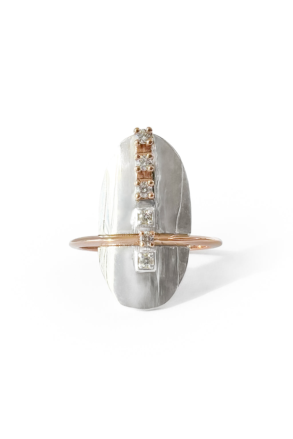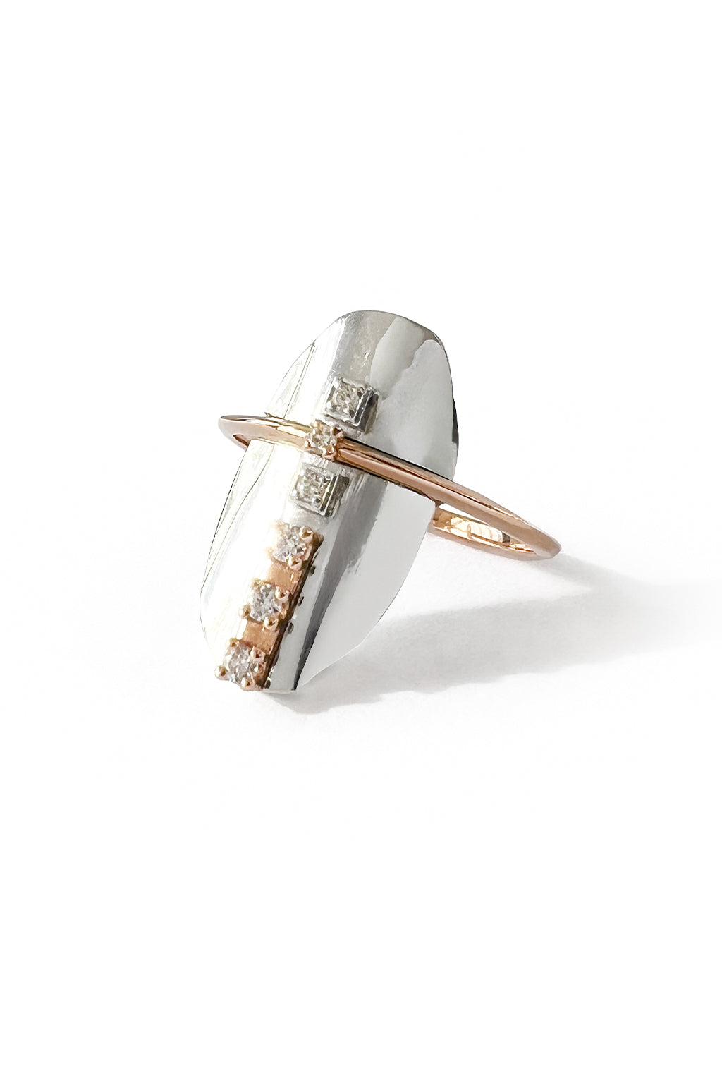 Sleek knife-edge shank ring crafted in 18k rose gold with a polished silver 20x11mm oval plaque centerpiece adorned with rose gold inlaid settings with diamonds.