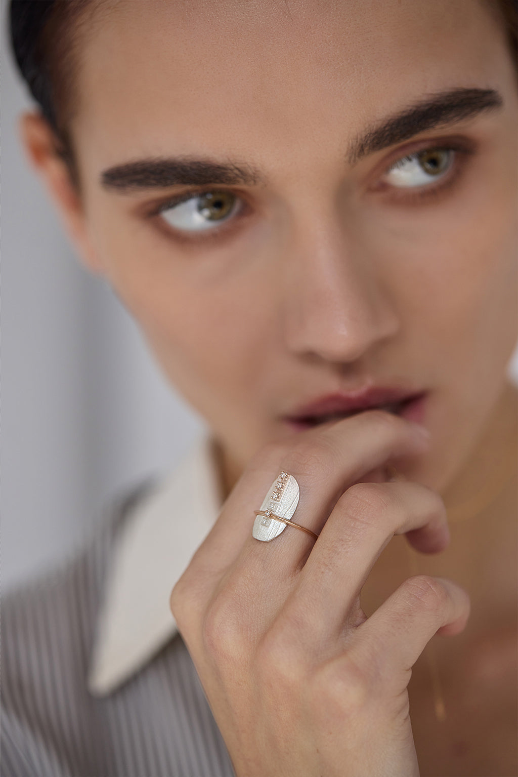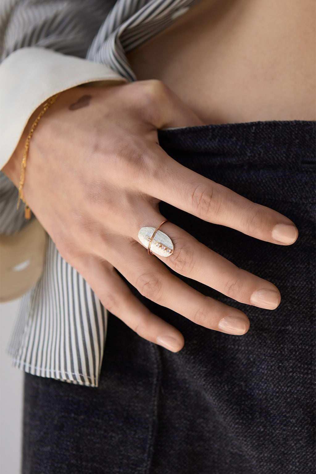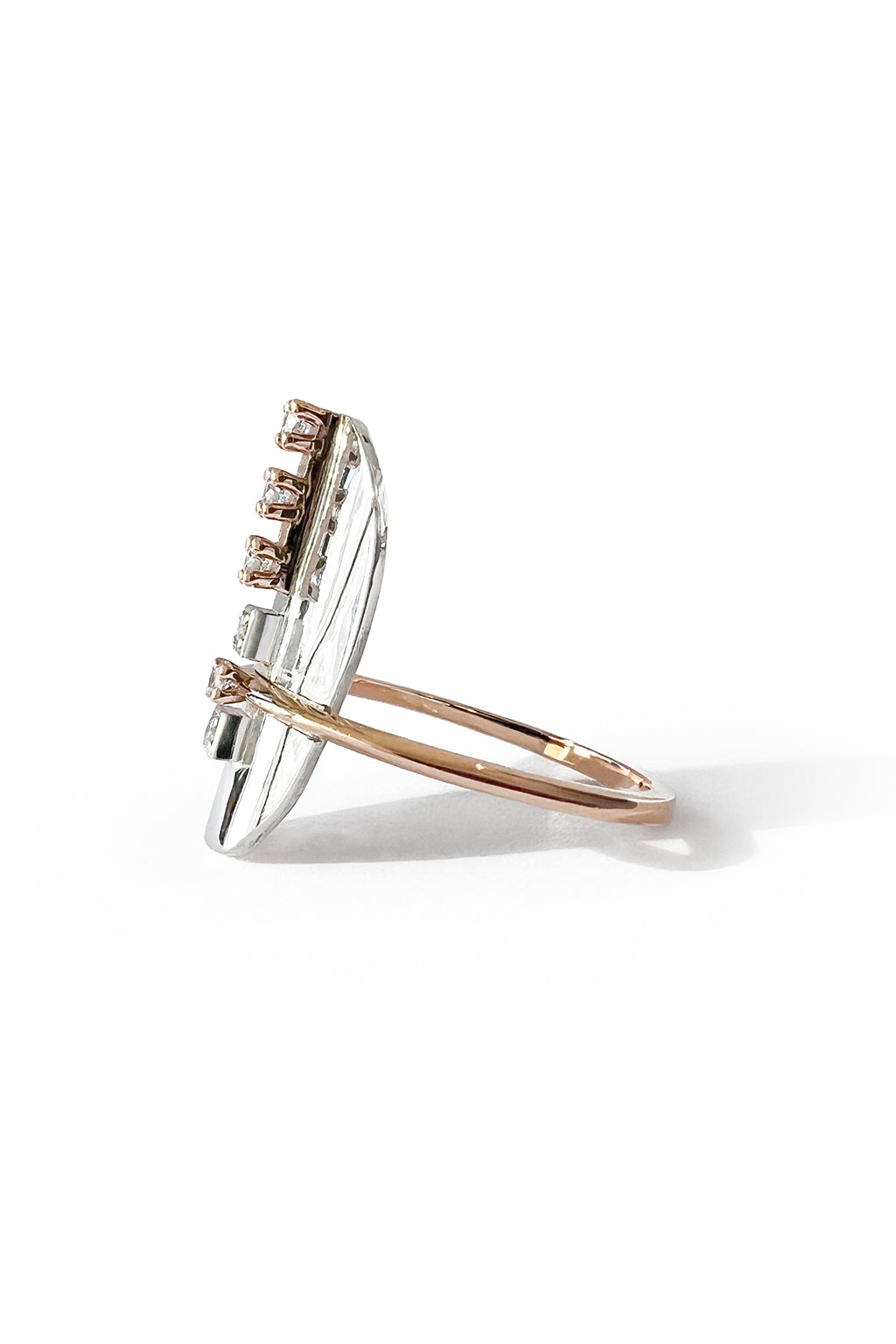 Sleek knife-edge shank ring crafted in 18k rose gold with a polished silver 20x11mm oval plaque centerpiece adorned with rose gold inlaid settings with diamonds.