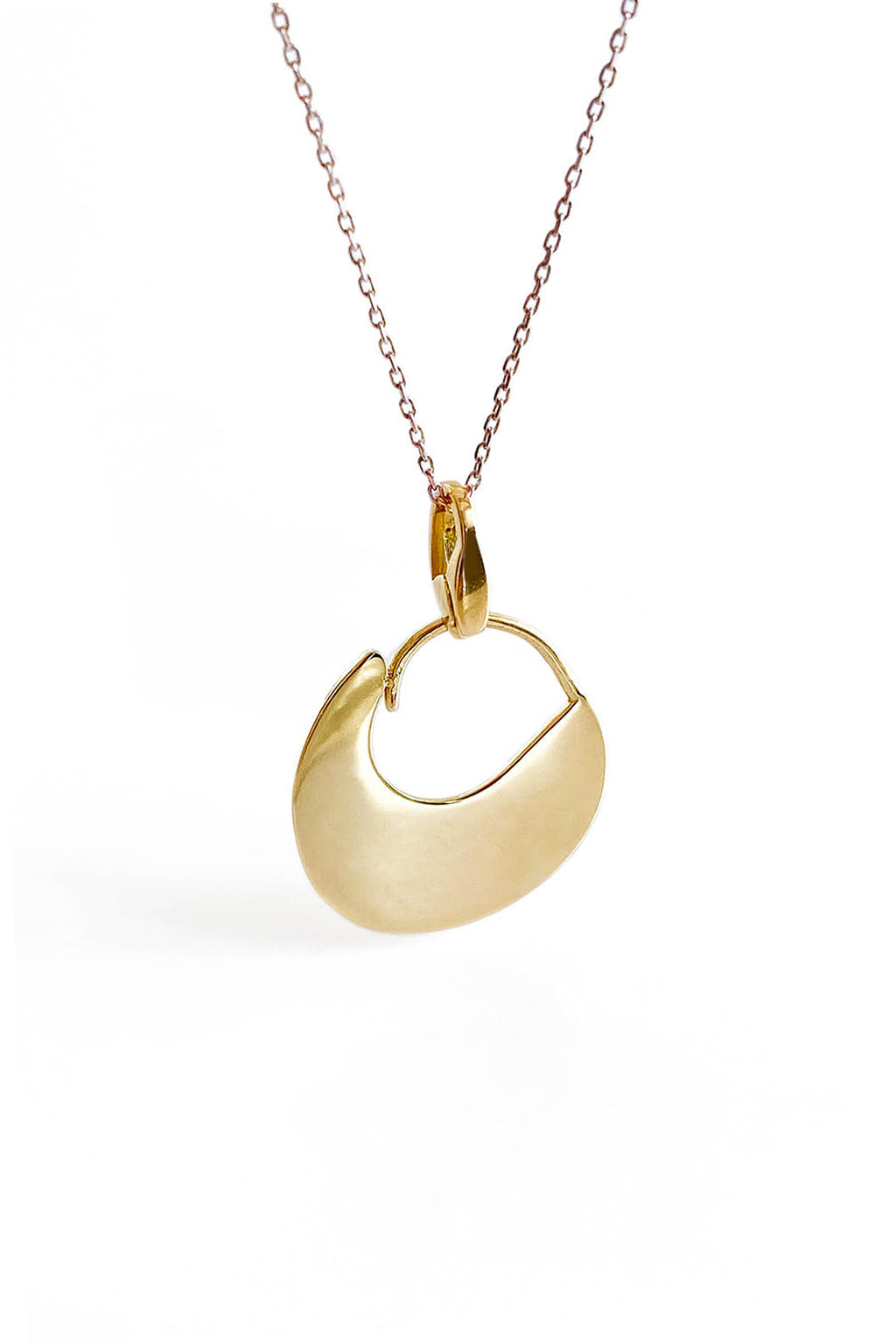 Collar hecho a mano con cadena de 42 cm en oro rosa de 18K y colgante en forma de media luna en oro amarillo de 18K de 0,6 mm de grosor y con dimensiones de 1,9 x 2 cm.