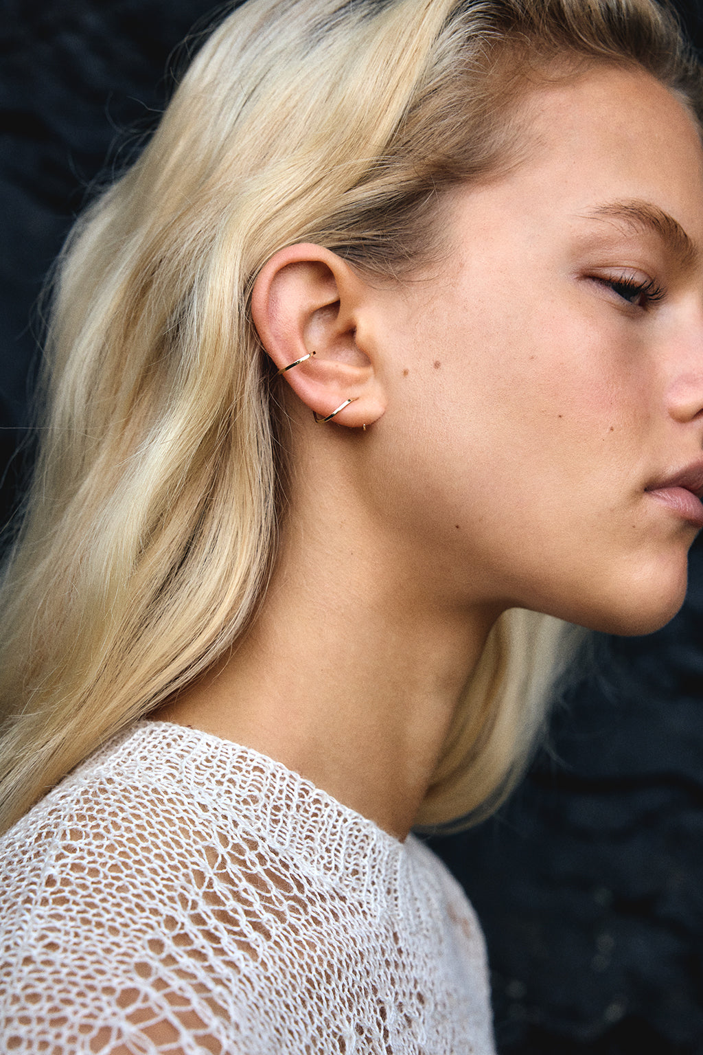 Ear cuff superior con un grosor de 1 mm y diámetro interior de 1,1 mm. Ear cuff inferior con un grosor de 1 mm. Distancia entre los ear cuffs de 18 mm.