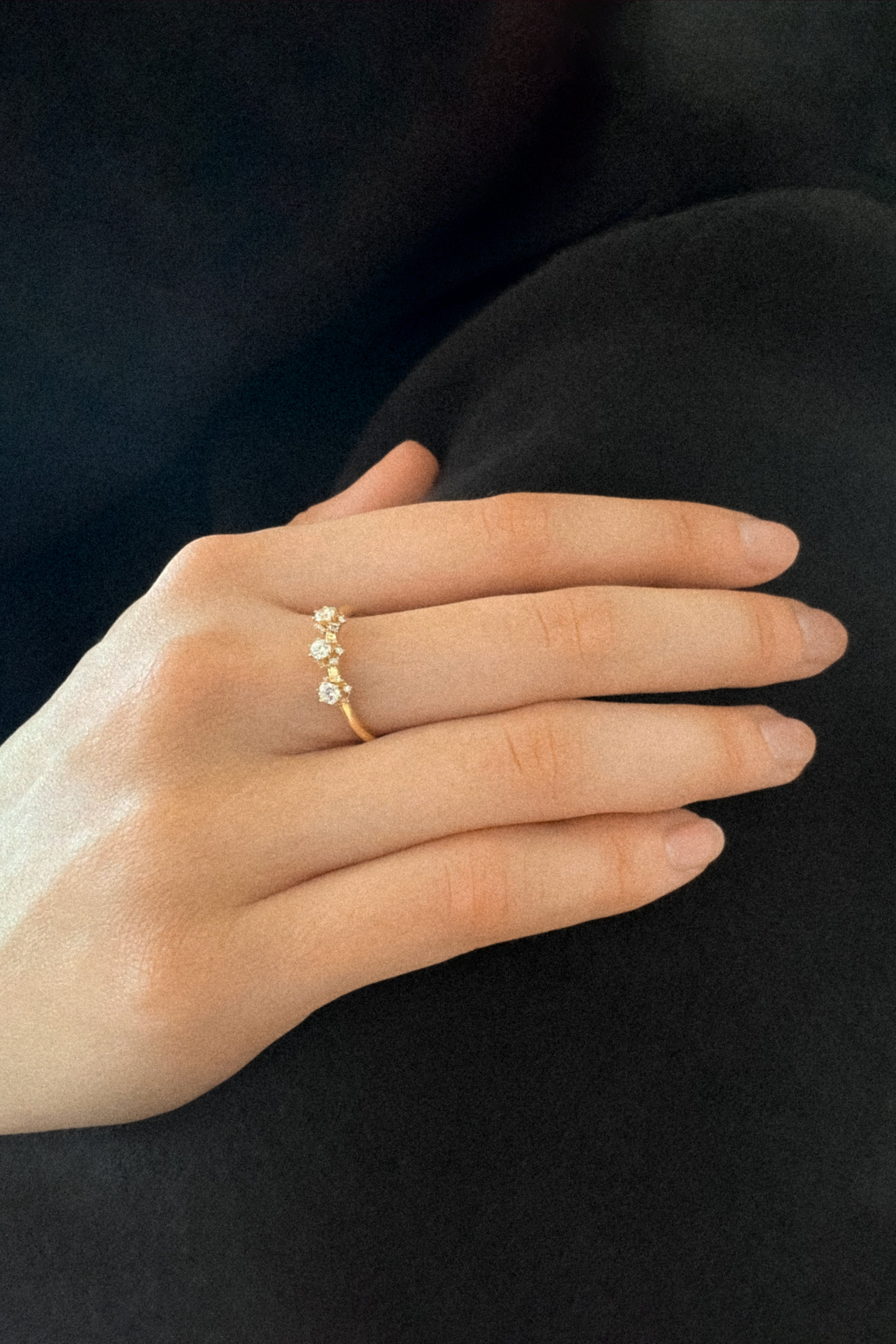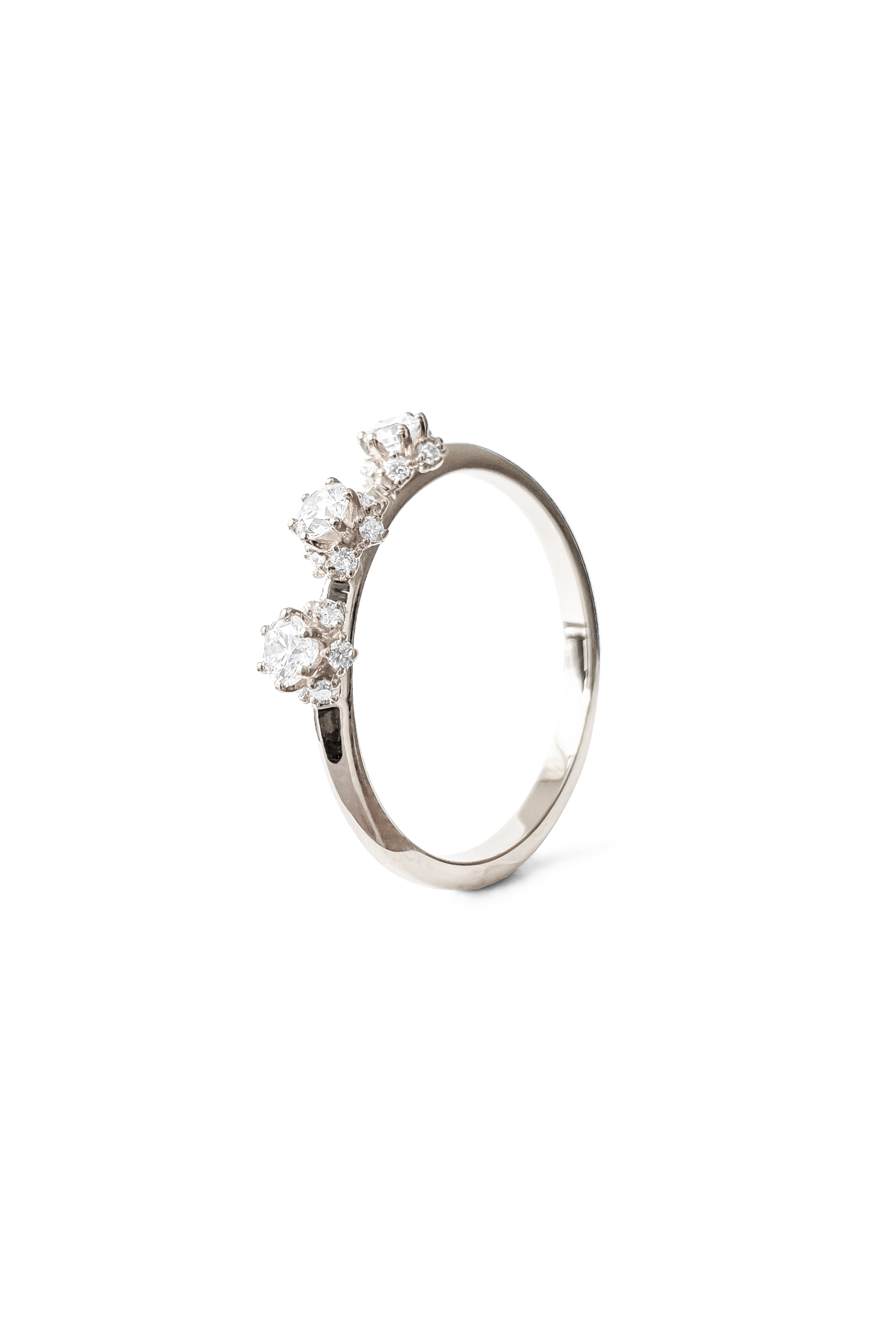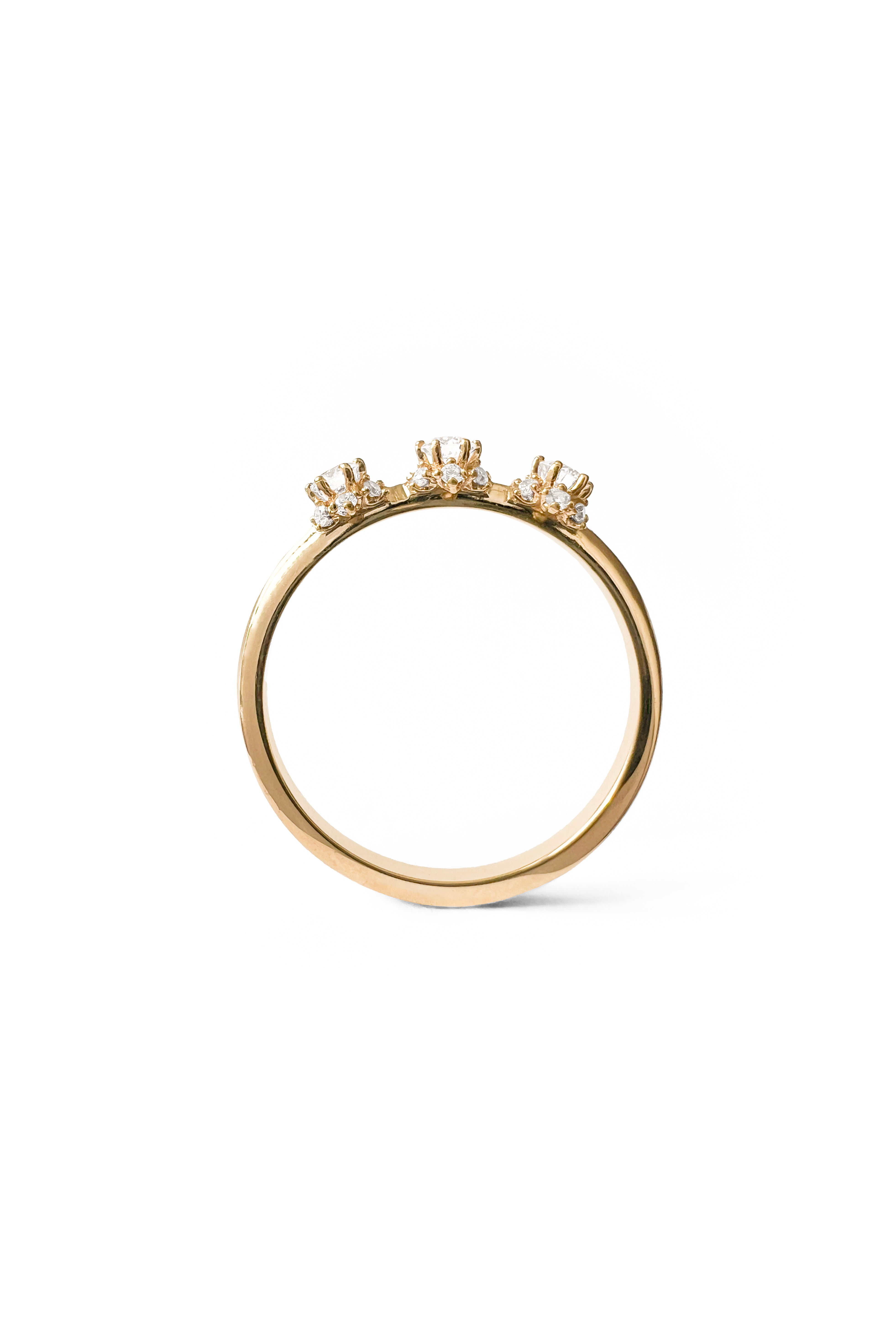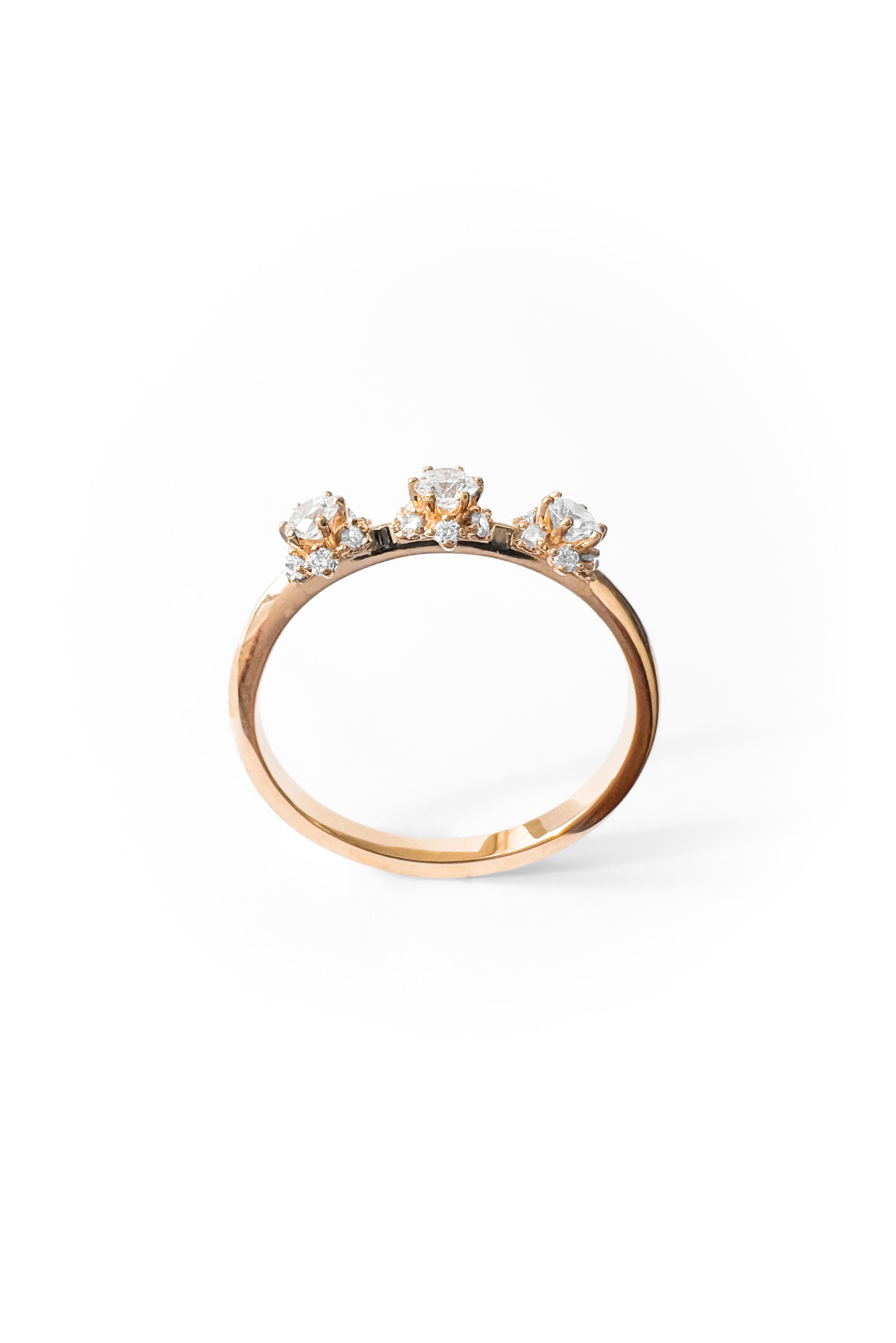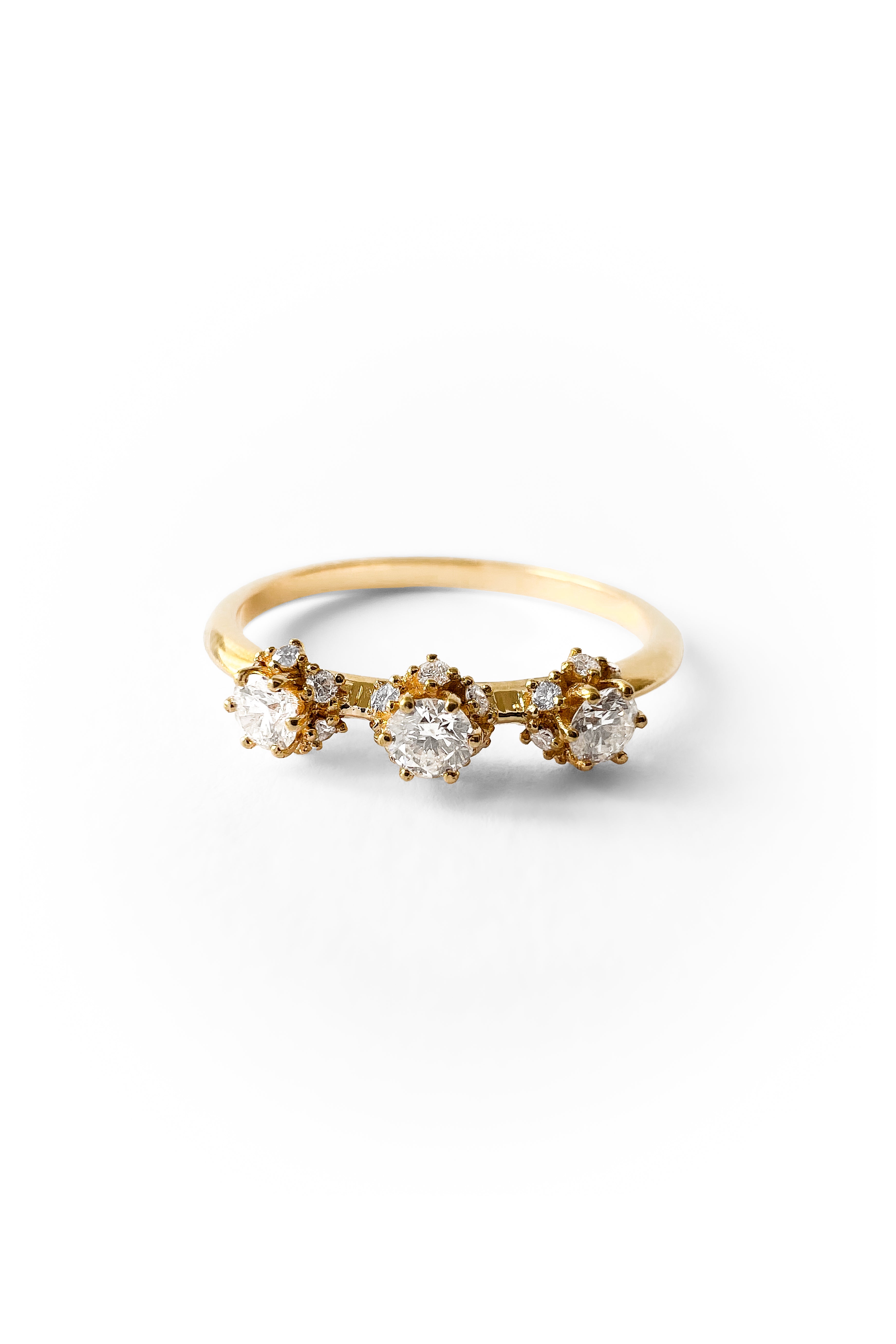 Anillo de oro de 18k con tres brillantes centrales engastados sobre una estructura de brillantes más pequeños en su base.