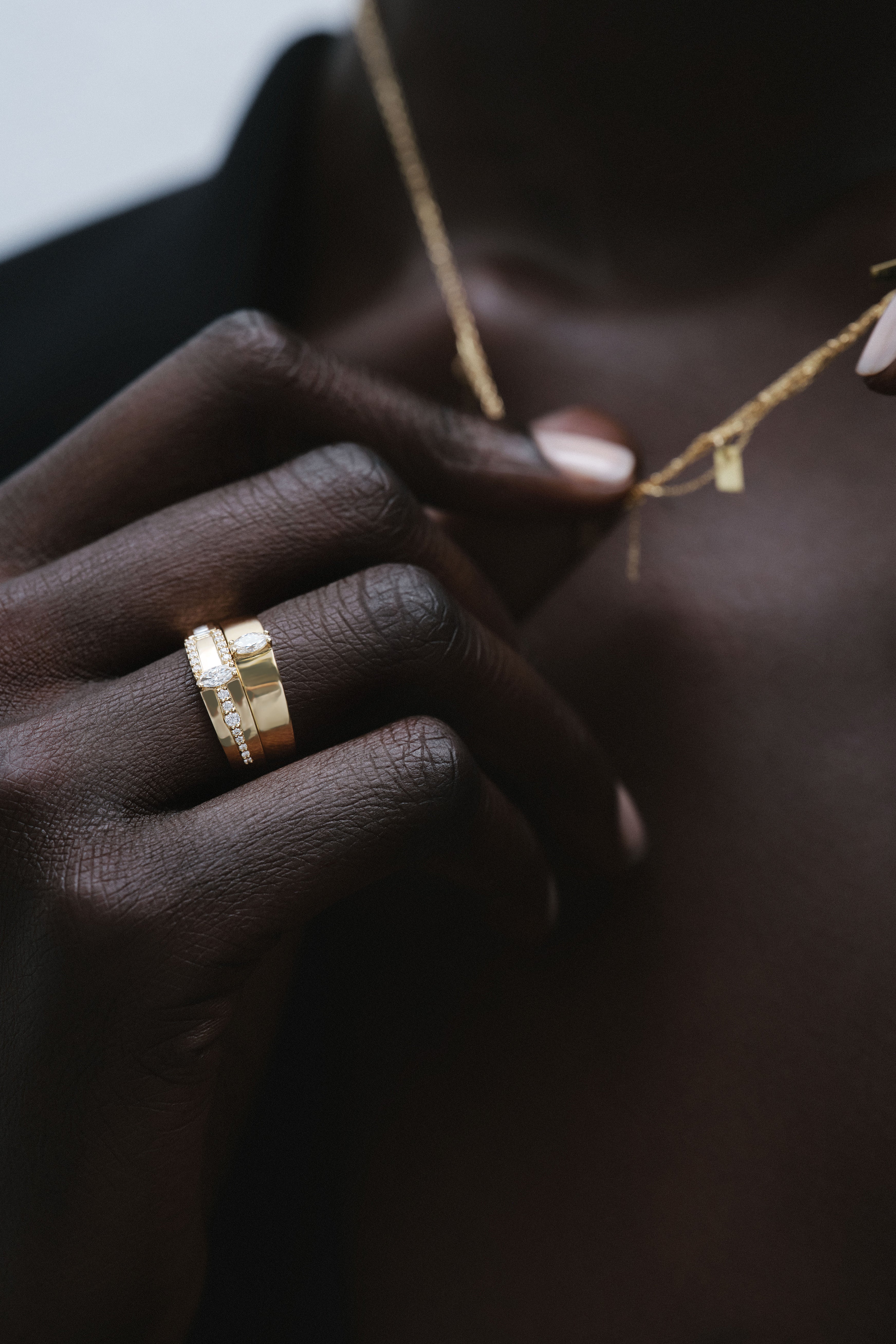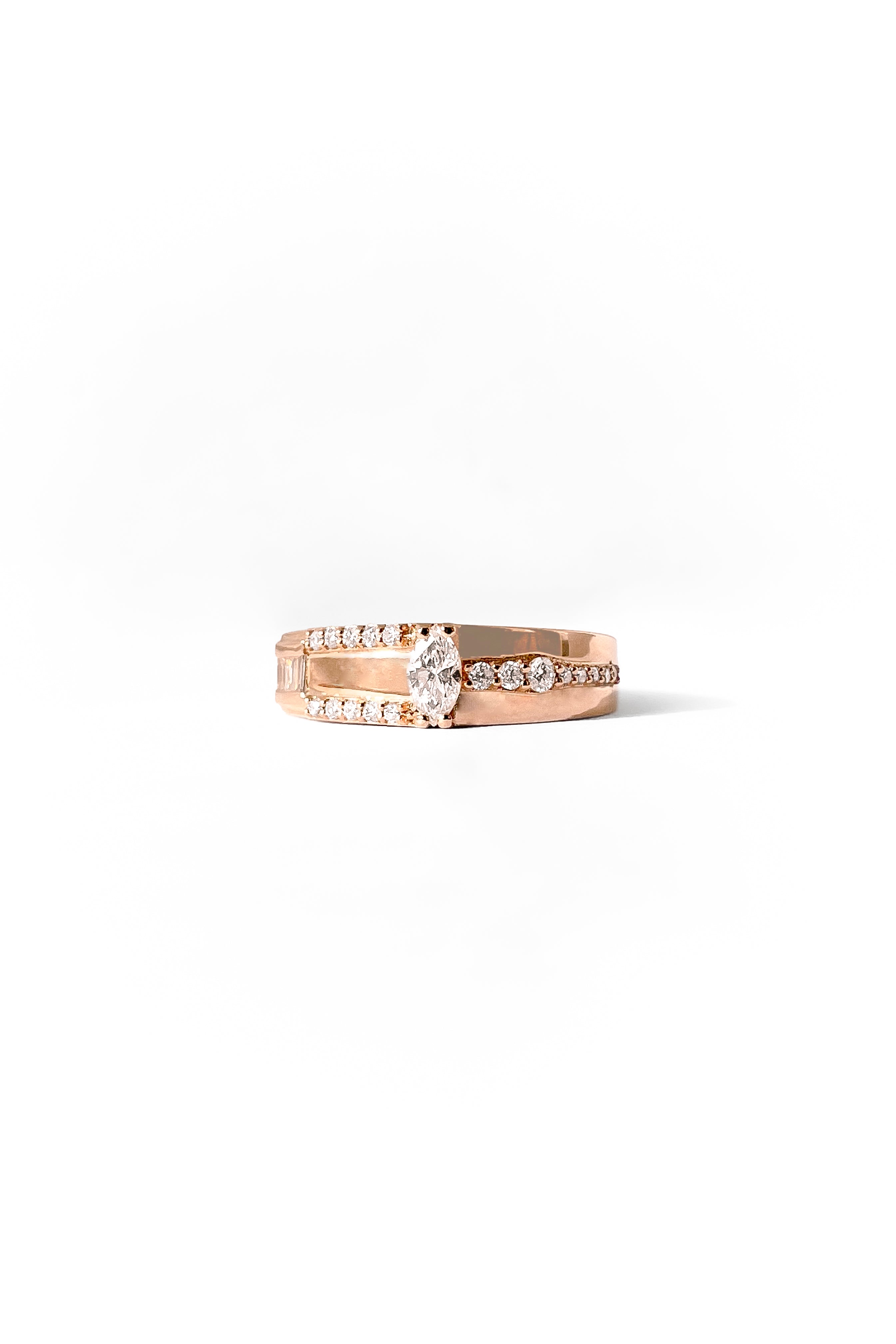 Cette bague présente un diamant marquise de 5 x 2,5 mm au centre d'un motif asymétrique de diamants sertis de différentes formes et tailles. Le bracelet en or 18 carats a une épaisseur de 1,5 mm.