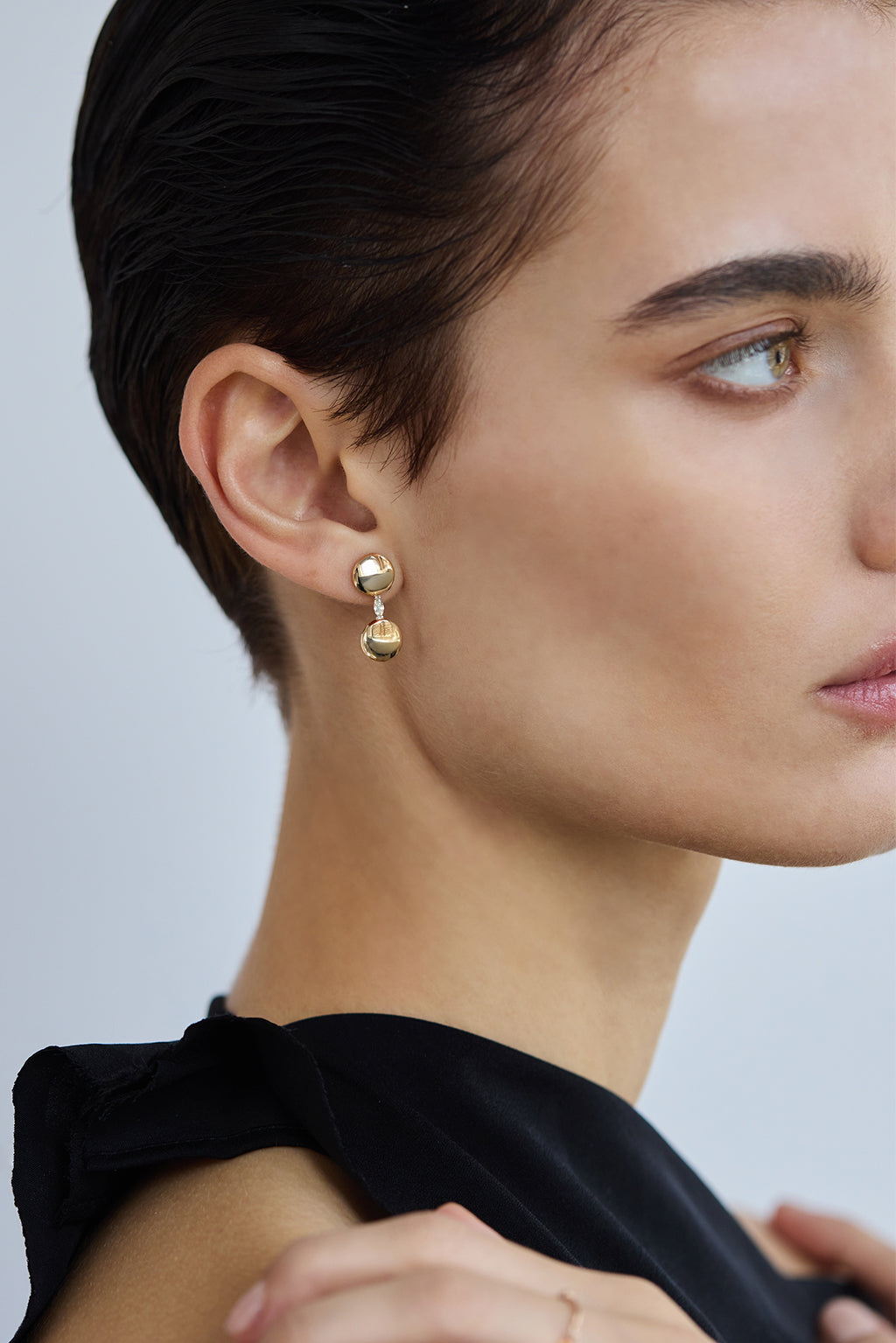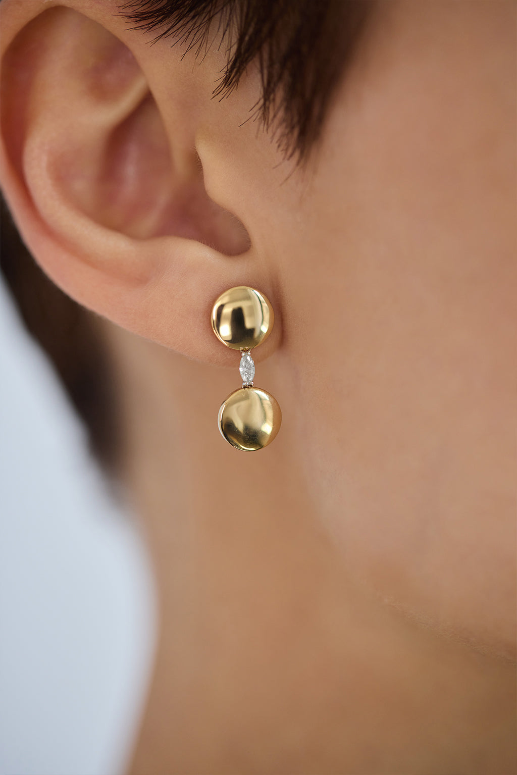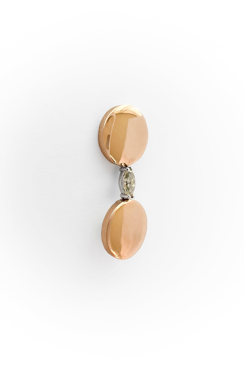 This 18K gold earring features two 9 mm polished discs, linked by a yellow marquise-cut diamond set in white gold. A refined and timeless design.