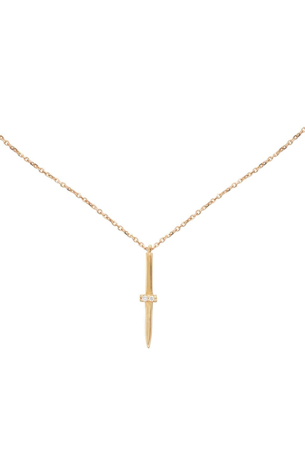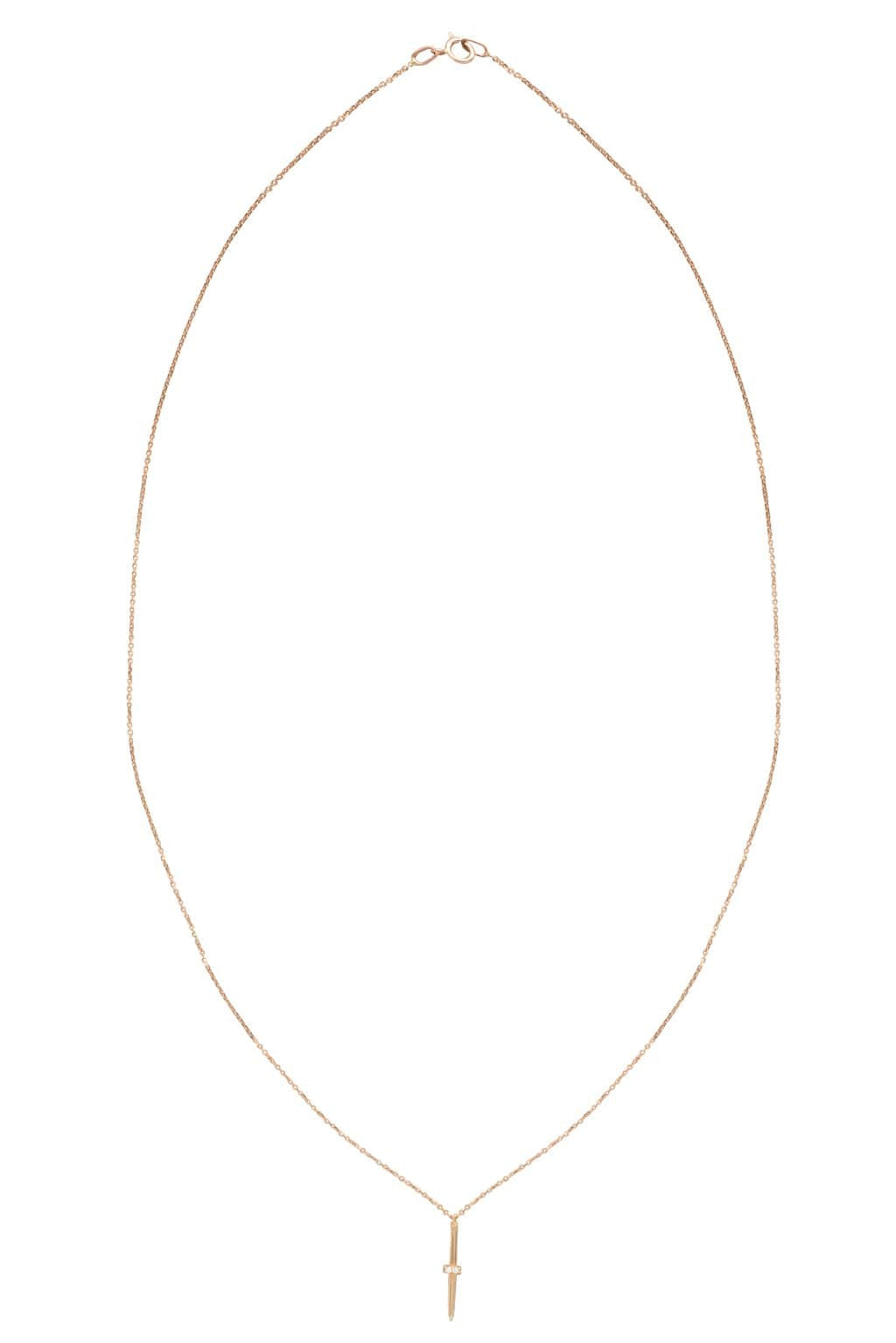 This 18K yellow gold necklace features a 42 cm long chain and a sword shaped gold pendant with two small diamonds.